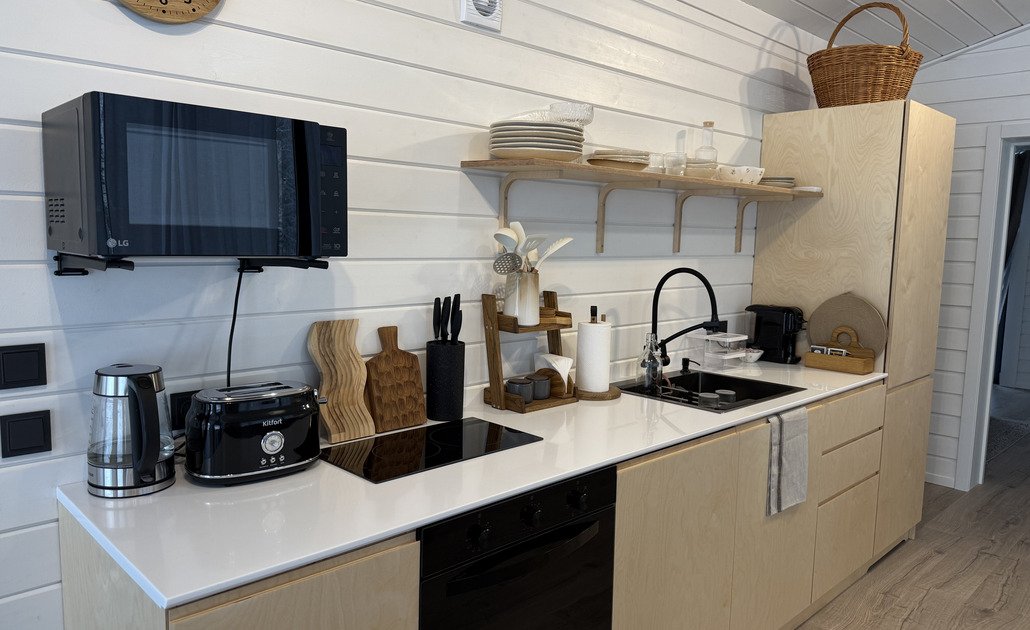 Приветственный набор включает кофе, чай, сахар, соль, крупы и масло. Санузел совмещен с ванной и снабжен всеми необходимыми ванными принадлежностями, а также стиральной машиной. На внешней территории имеется мангальная зона для шашлыков и барбекю, а также костровая зона с пятью удобными креслами и чашей. Гости могут пользоваться дровами и углем (оплачиваются отдельно) или привезти свои.