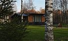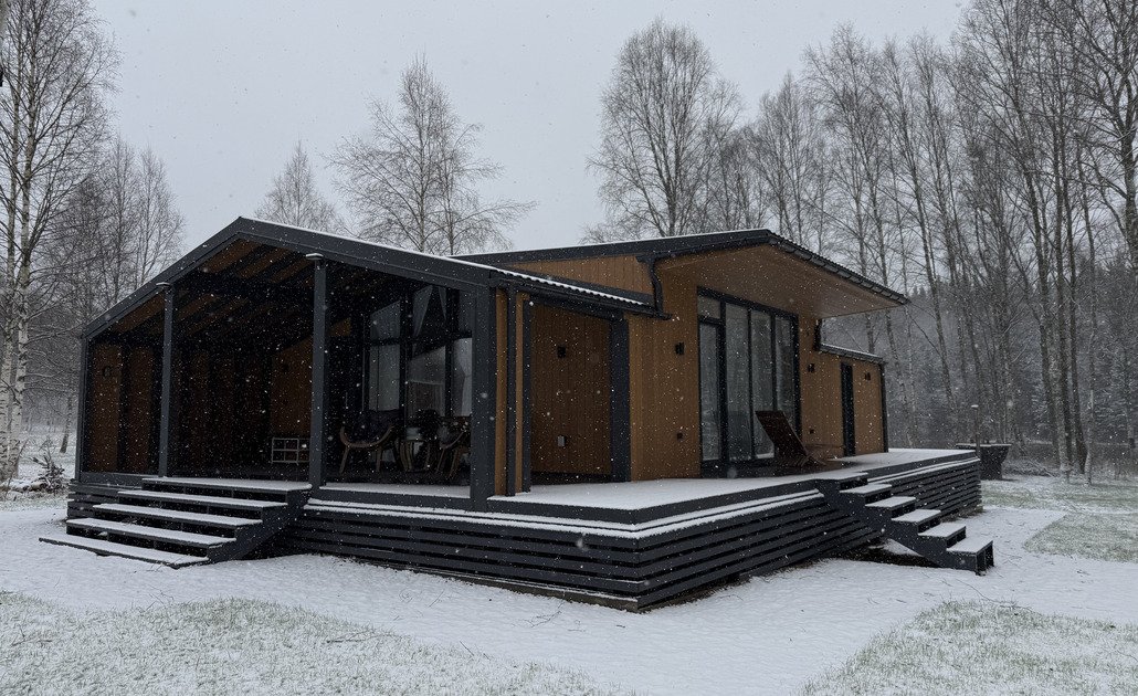 Одноэтажный барнхаус с двумя спальнями, круговой террасой и собственным выходом к лесному озеру расположился в охраняемом коттеджном поселке Савельево. Площадь дома составляет девяносто два квадратных метра вместе с просторной крытой террасой, а сам он находится на лесном участке в двадцать пять соток, который включает три парковочных места.