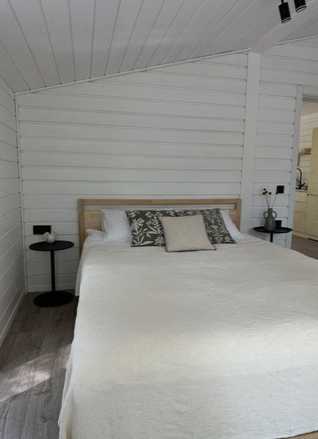 В этом барнхаусе есть две спальни, просторная светлая гостиная и круговая терраса, что делает его прекрасным местом для отдыха в любое время года. Он может вместить до пяти человек, удовлетворяя потребности как романтических или семейных пар, так и небольших дружеских компаний. Дом оснащен оборудованной кухней и современной техникой, включая теплые полы, конвекторы и кондиционер, что обеспечивает максимальный комфорт и уют.
