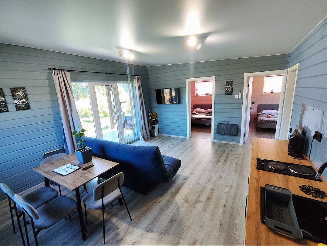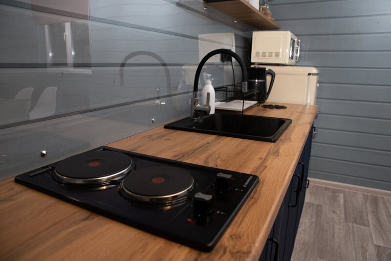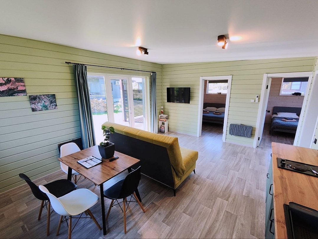 Wi-Fi, холодильник, кулер, фен, плита для приготовления пищи, микроволновая печь, обогреватель, душевая кабина, санузел, банные полотенца, тапочки, терраса, диван, стулья, вешалки, зеркало, кухня, чайный набор, набор посуды, чайник, раковина, питьевая вода, гостиная зона, отопление, две спальни, вид во двор, две кровати «Queen size», кухонная утварь, столовые приборы, стиральная машина и сушилка, стол, мангал, панорамные окна, диван-кровать, телевизор со Smart TV, межкомнатная дверь, набор для приготовления чая и кофе, бутилированная вода, мини-бар (платно), веранда, частный двор, стульчик для кормления ребенка, можно с питомцамиВ доме