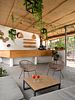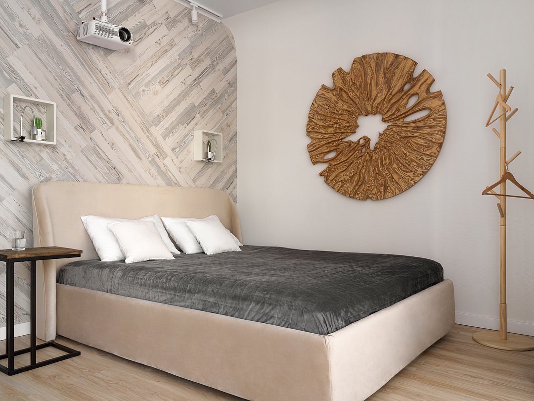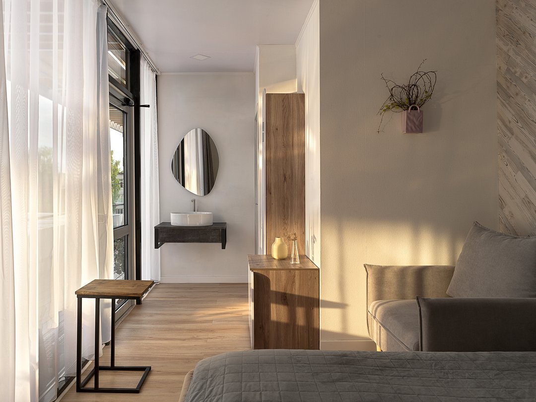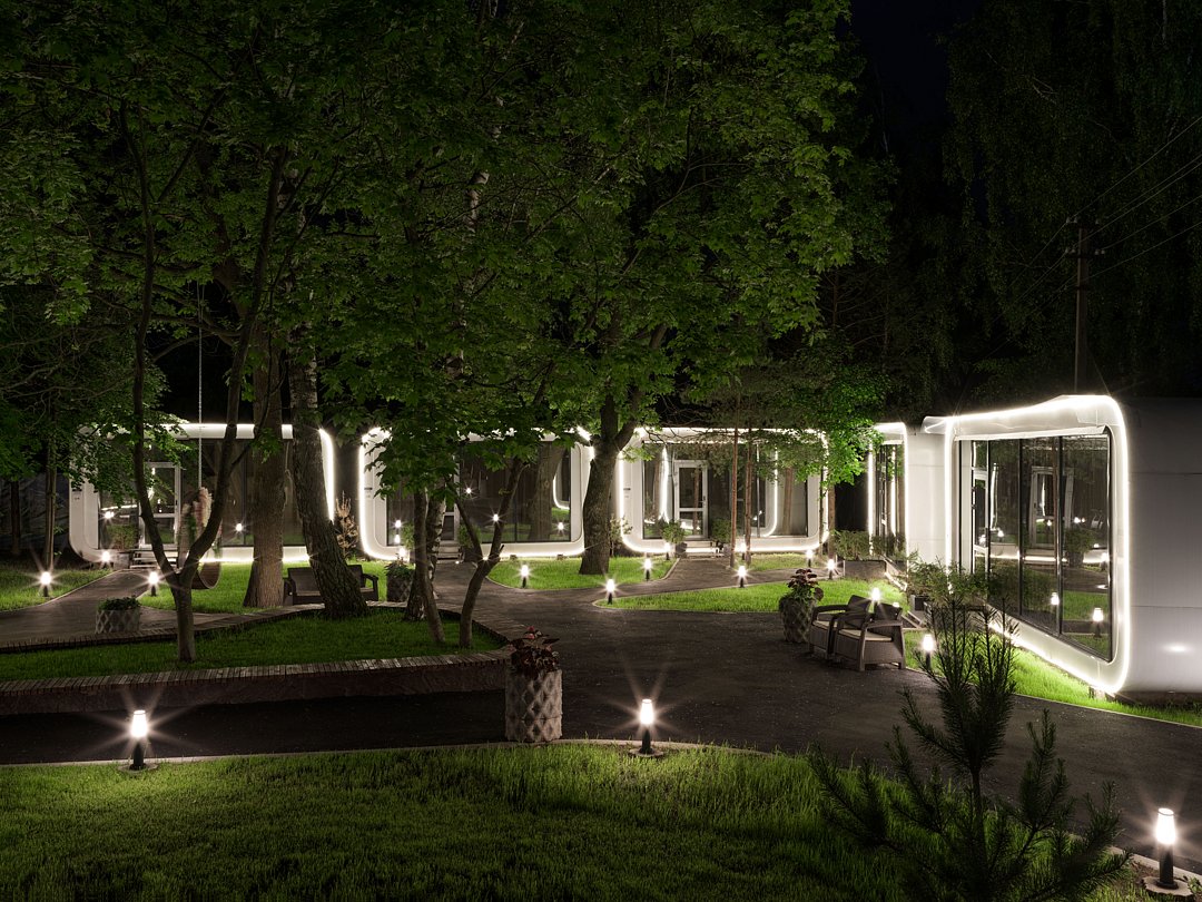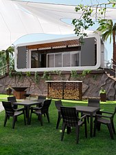Укомплектован большой удобной двуспальной кроватью, а также встроенным дополнительным (третьим) спальным местом для размещения гостей или ребёнка. Особенностью модульного домика является его расположение и интеграция с природой: установлен на общей просторной веранде с панорамными видами. Отдых в любое время года дополнят встроенный проектор для создания приватного кинотеатра, высокоскоростной Wi-Fi и климат-контроль(сплит-система) для поддержания идеальной температуры. Санузел с душевой кабиной выполнен в современном стиле, гостям предоставляются качественные средства личной гигиены и банные принадлежности. Общая площадь модульного домика составляет 13,5 кв. м. Его продуманная эргономика, прочная конструкция и панорамное остекление позволяют почувствовать полное единение с природой, не жертвуя современным комфортом.