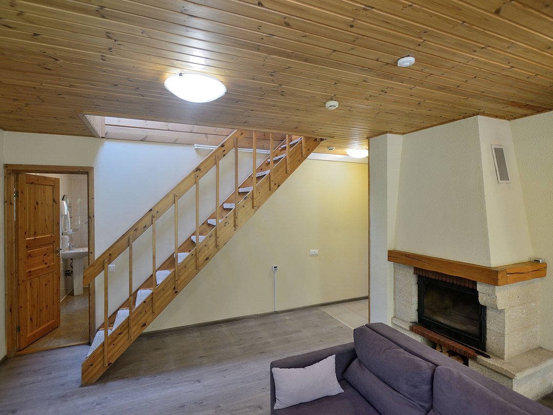 Первый этаж: гостиная с камином, спальня с двумя односпальными кроватями, кухня - столовая, санузел, душ.