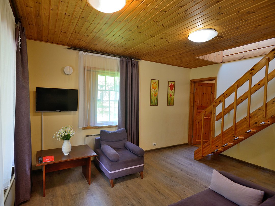 Первый этаж: гостиная, кресла, холл со столами и кухонными принадлежностями, холодильник, микроволновая печь, две спальни с односпальными кроватями (2 кровати и 4 кровати), санузел, душ.