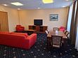 Двуспальнае кровать, диван, 2 кресла, прихожая, шифоньер, телевизор, стол, стулья, санузел, электрочайник, чайная посуда, кувшин и стаканы для воды, мини-холодильник, ковролиновое покрытие пола.