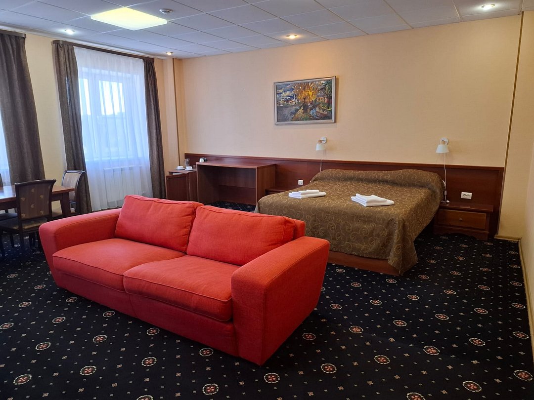 Размещение 2 гостей, двуспальная кровать, диван, холодильник, рабочее место, чайник, чайная посуда, телевизор, гардероб, ванна, косметика, Wi-Fi.