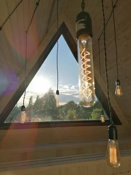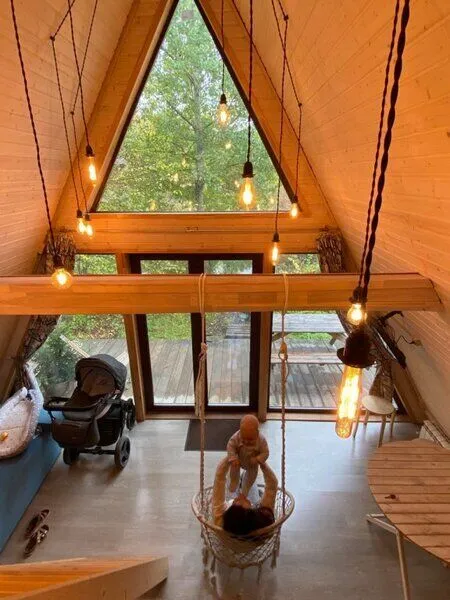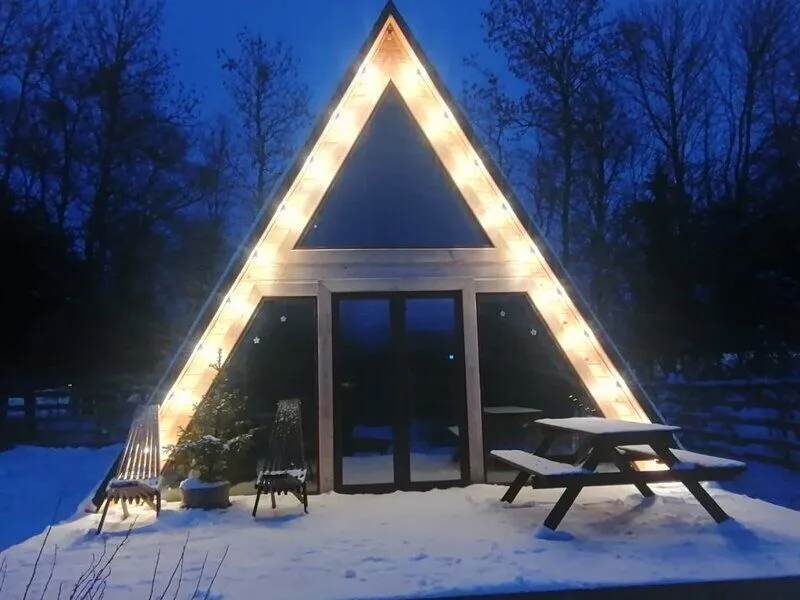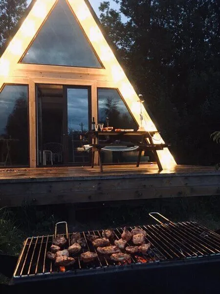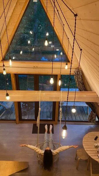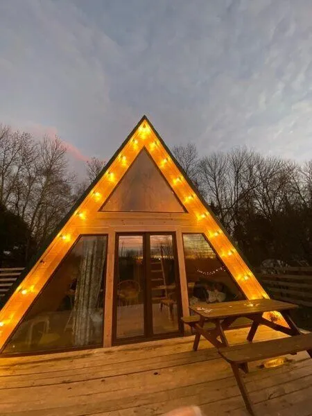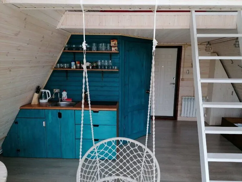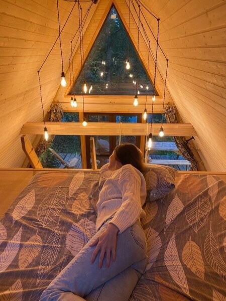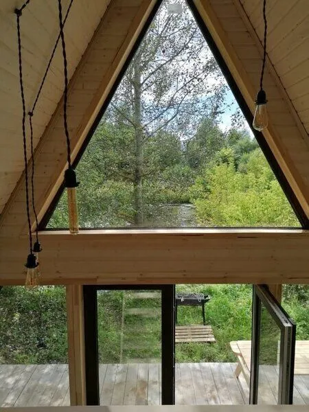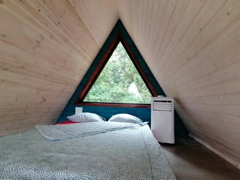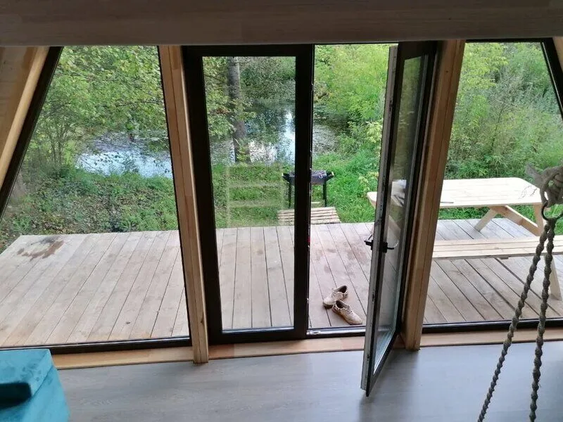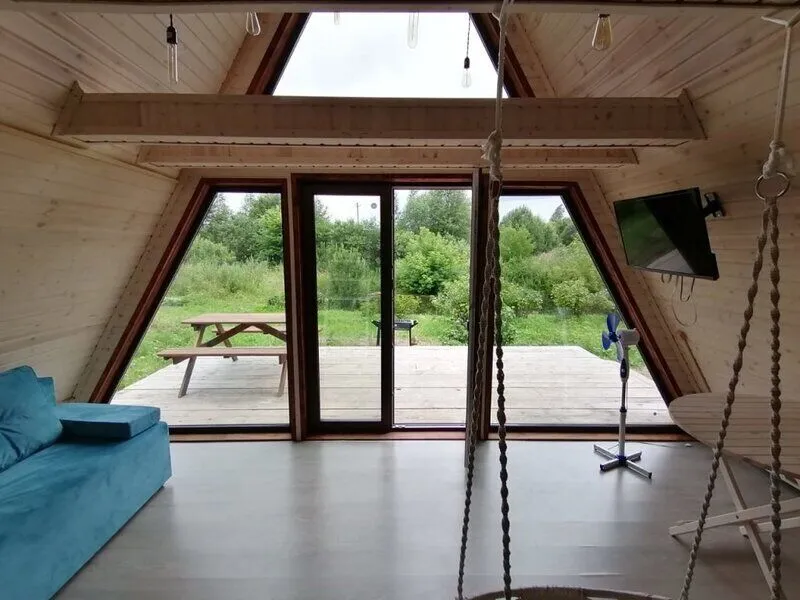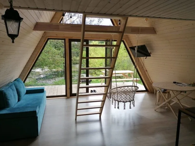 Для комфортного проживания гостей предусмотрены уютные треугольные домики. Во всех домах имеются собственные ванные комнаты, телевизоры, Wi-Fi и удобные спальные места. Домики окружены лиственными деревьями, а с окон открывается вид на пруд.