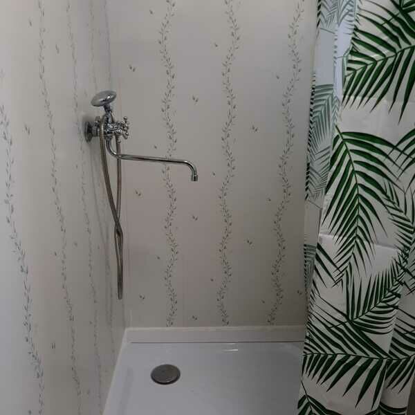ванная комната с душевой зоной. Имеется телевизор, холодильник, электрочайник, небольшая