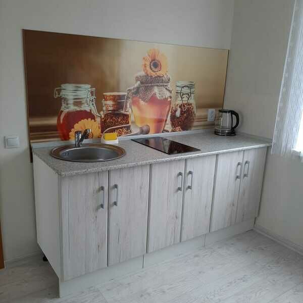ванная комната с душевой зоной. Имеется телевизор, холодильник, электрочайник, небольшая кухня с электрической варочной панелью, посуда для приготовления пищи. Вода подаётся из собственного колодца.