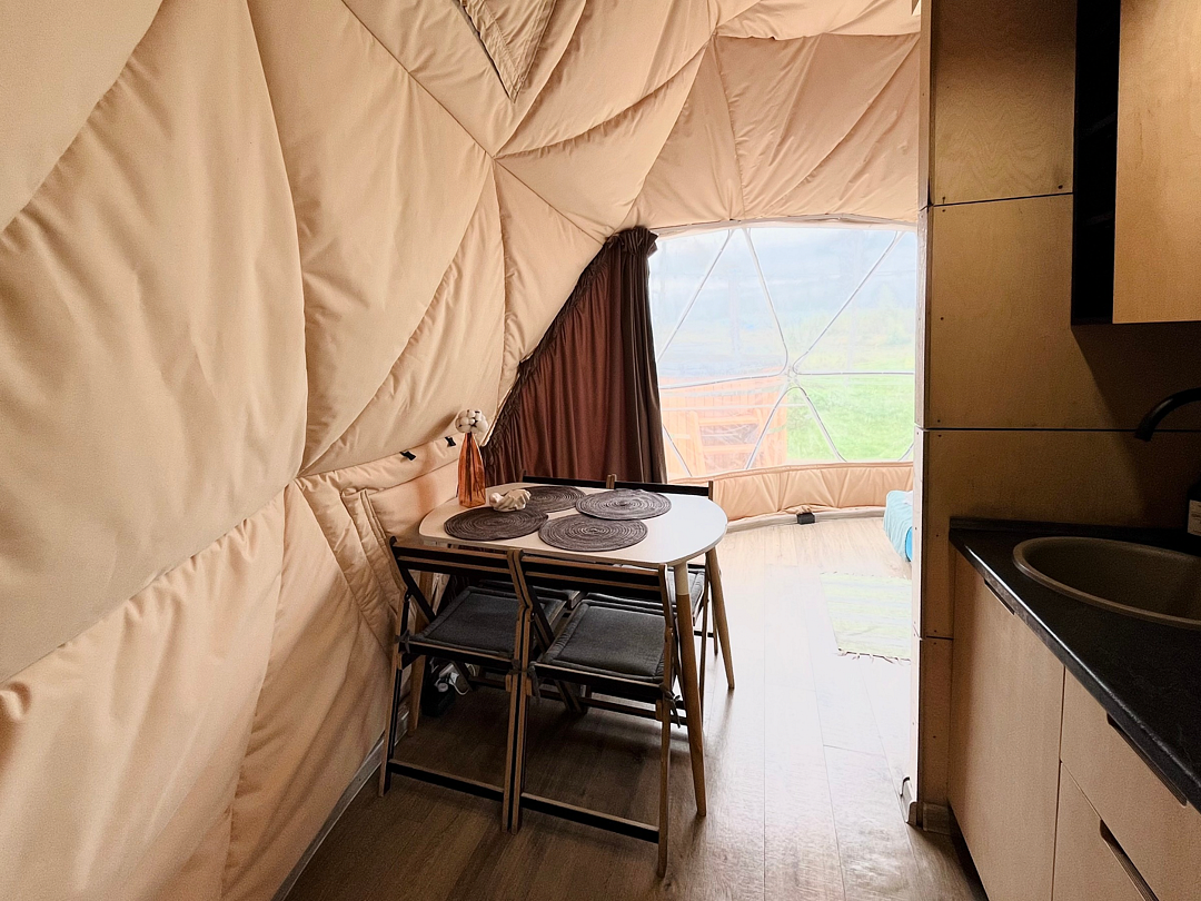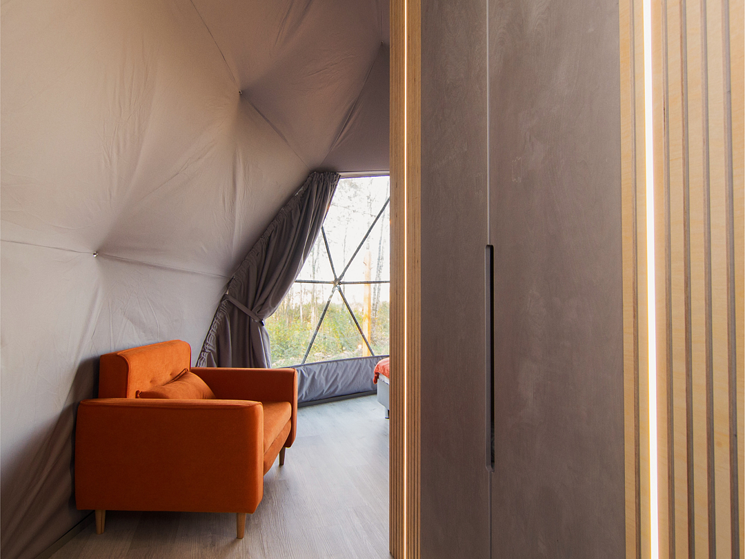 Просторный геокупол для 2–4 человек с двуспальной кроватью, полутороспальной кроватью и креслом-кроватью.