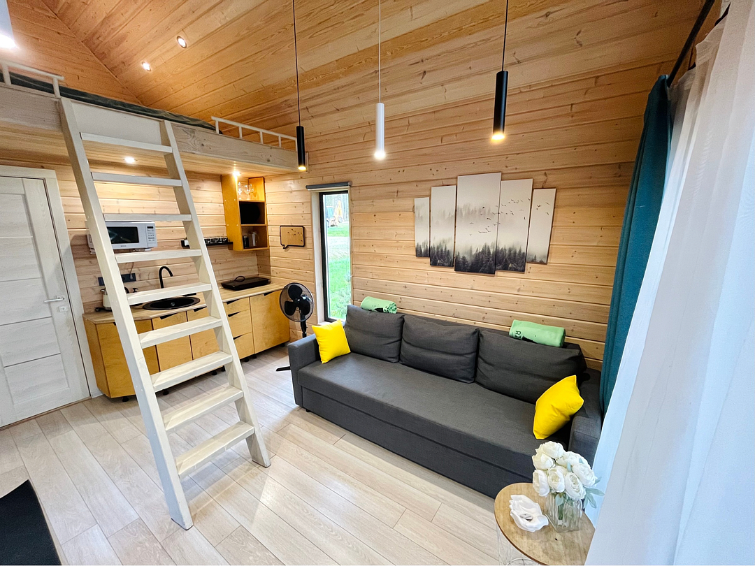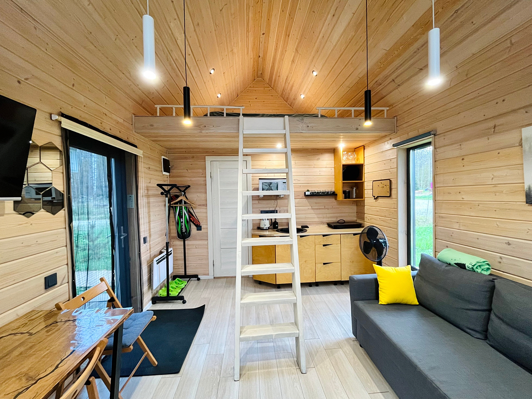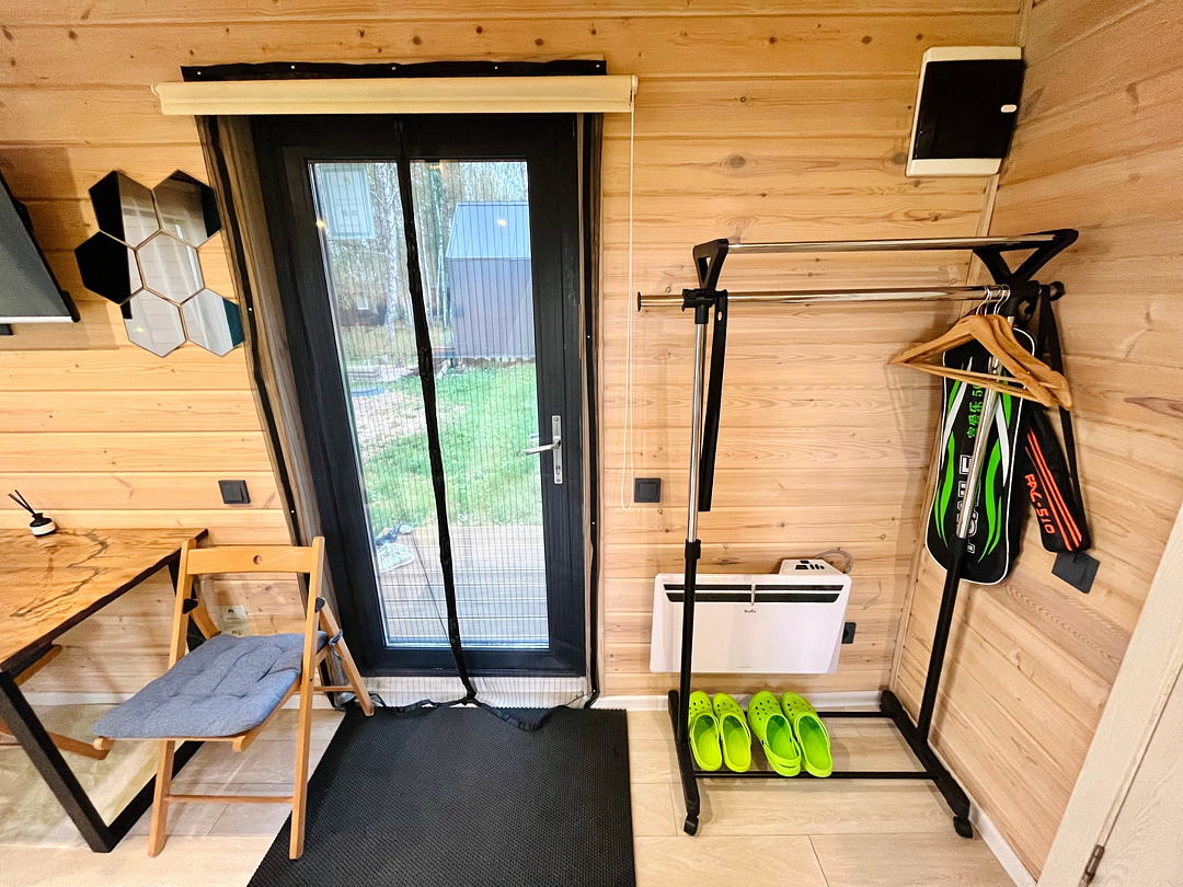 В доме собственный санузел, мини-кухня и конвектор отопления. Панорамное окно выходит на собственную террасу с садовой мебелью. Рядом с домом расположена зона для мангала. В доме установлен телевизор со smart TV. Без ночевки возможно нахождение на территории более 4-х человек.