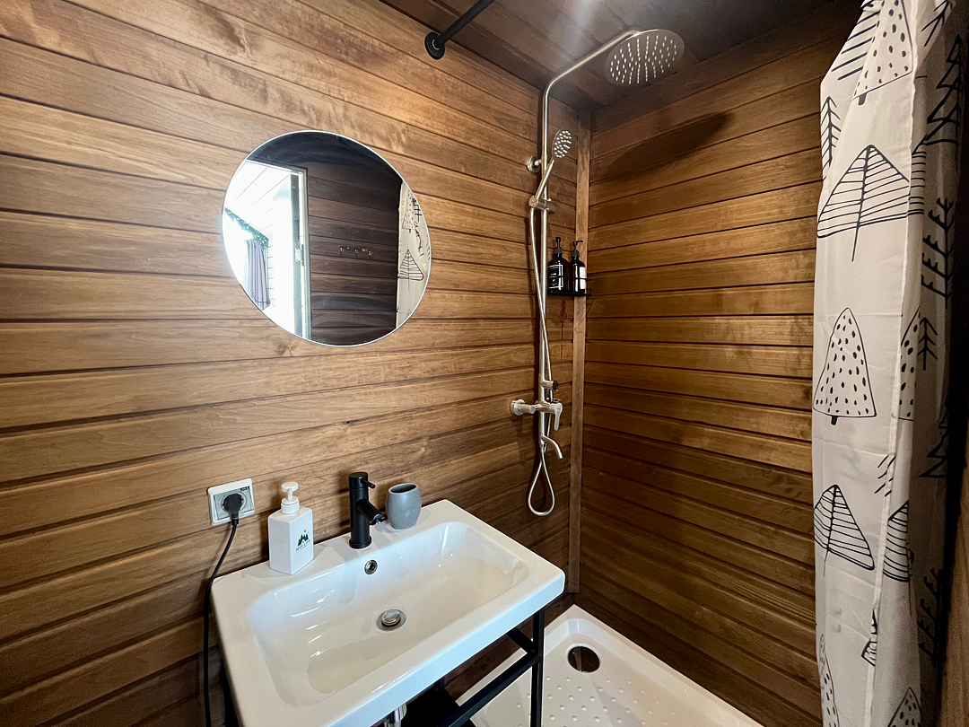 В доме собственный санузел, мини-кухня и конвектор отопления. Панорамное окно выходит на собственную террасу с садовой мебелью. Рядом с домом расположена зона для мангала. В доме установлен телевизор со smart TV. Без ночевки возможно нахождение на территории более 4х человек.
