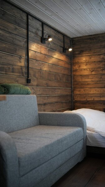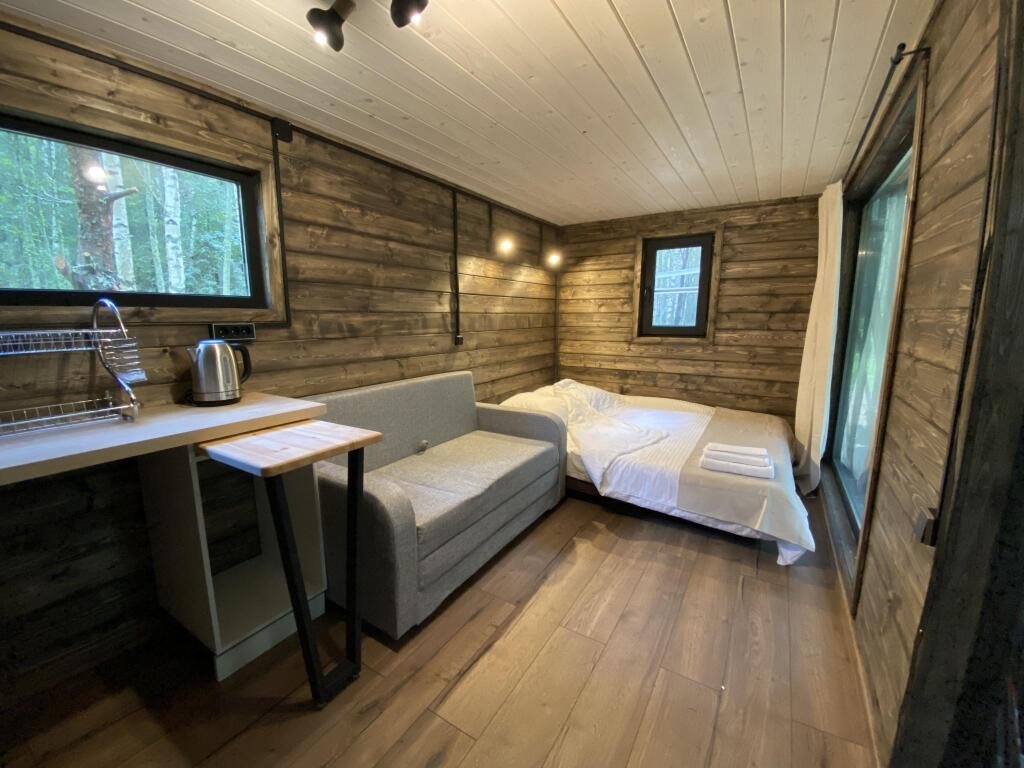 Вас ожидают комфортабельные эко-домики с уютной атмосферой и всеми необходимыми для отдыха удобствами. Каждое жилье имеет просторную террасу, панорамное окно с великолепным видом на хвойный лес, двуспальную кровать, раскладной диван, мини-кухню и ванную комнату с душем.