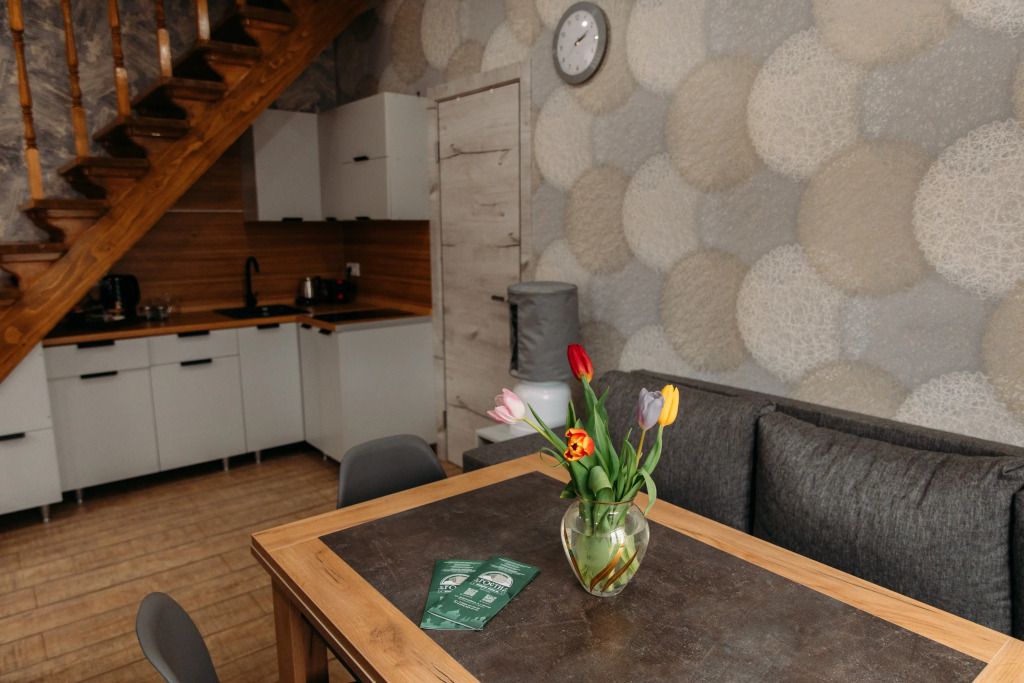 Гостевой дом представляет собой семь современных двухэтажных номеров с отдельным входом, вместимостью от 4 до 7 гостей. В каждом номере есть кухня и всё для комфортного проживания и отдыха. На территории расположены детская площадка, пинг-понг, мангалы, садовые качели и уличные беседки для вечернего отдыха семьёй или компанией друзей. Отель оборудован бесплатной парковкой.