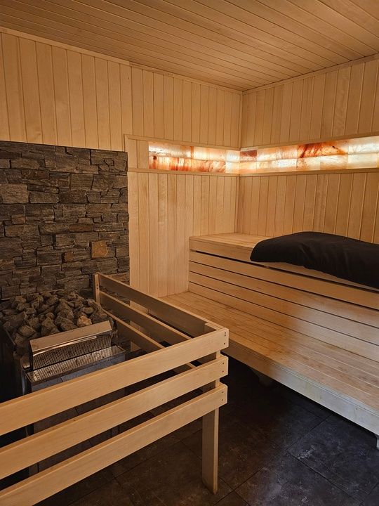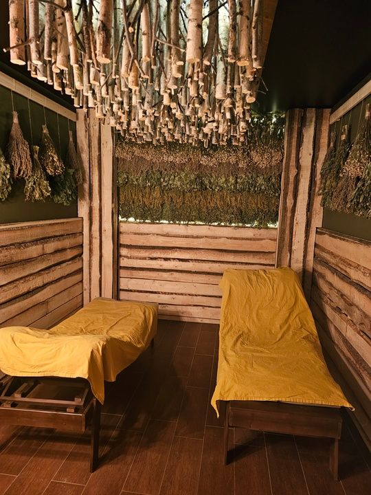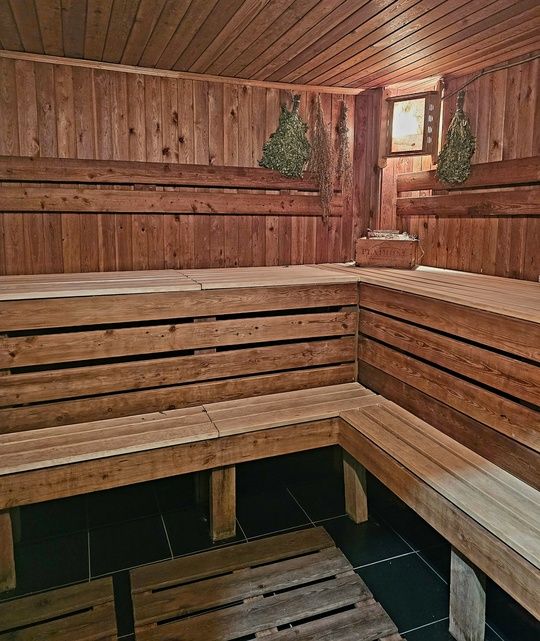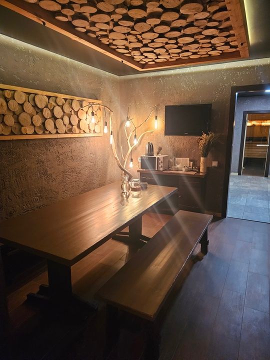 Парная, бассейн (+26), крио камера со снегом, зона отдыха с большим столом, телевизором, посудой, чай, фито комната, душевая, обливное ведро, санузел, фен. В бассейне гейзер и водопад.