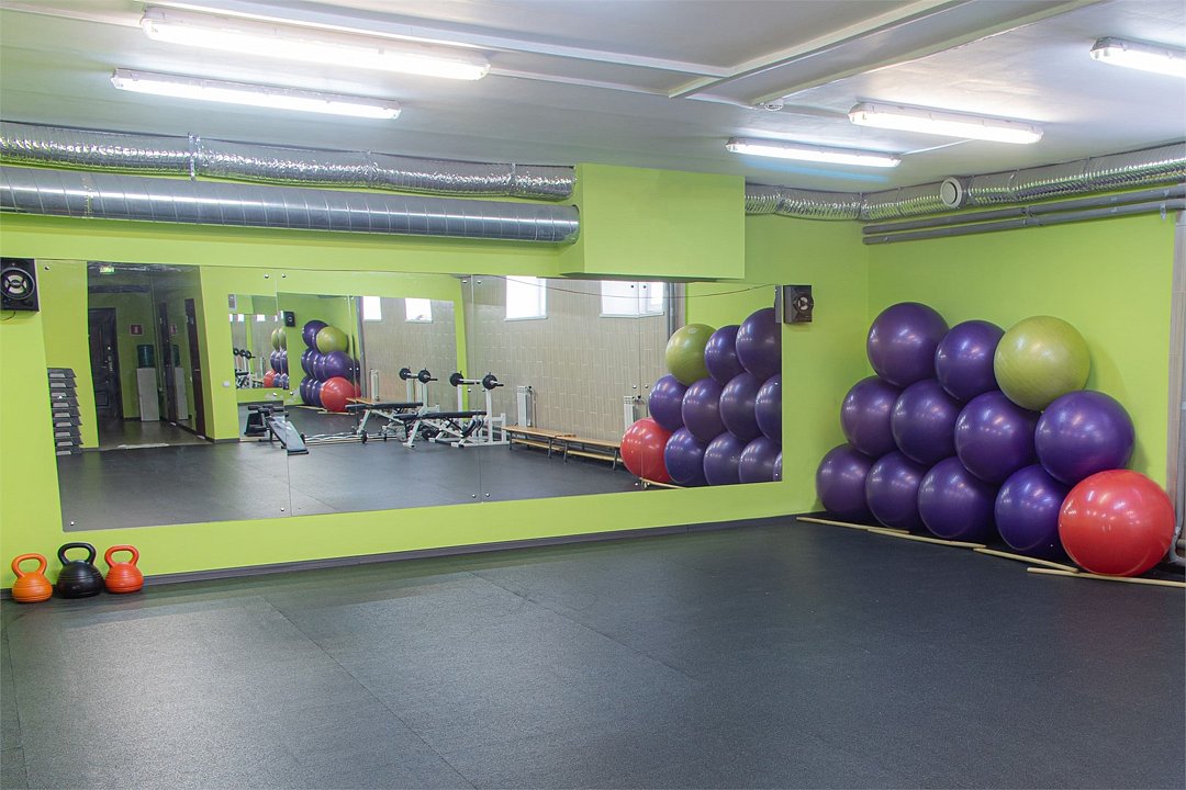 Зал оснащен тренажерами для упражнений на основные группы мышц — скамья для жима, силовая скамья, турник, свободные веса, штанга, снаряды для фитнеса: фитболы, гимнастические палки, гимнастические обручи, скакалки, степы.