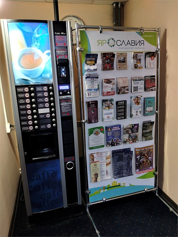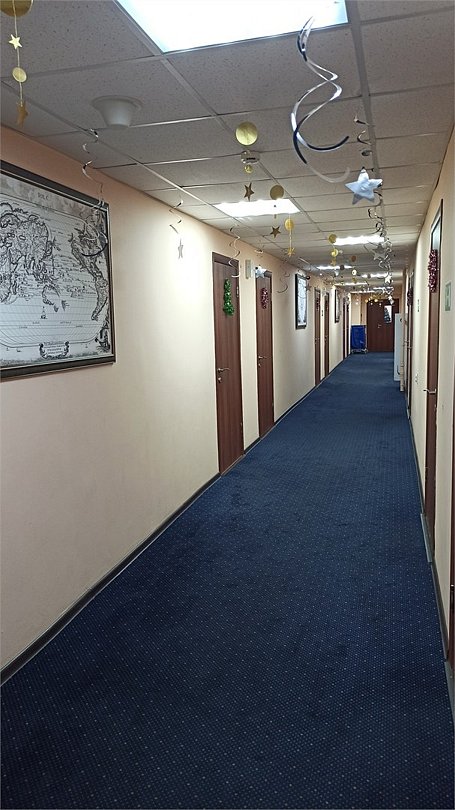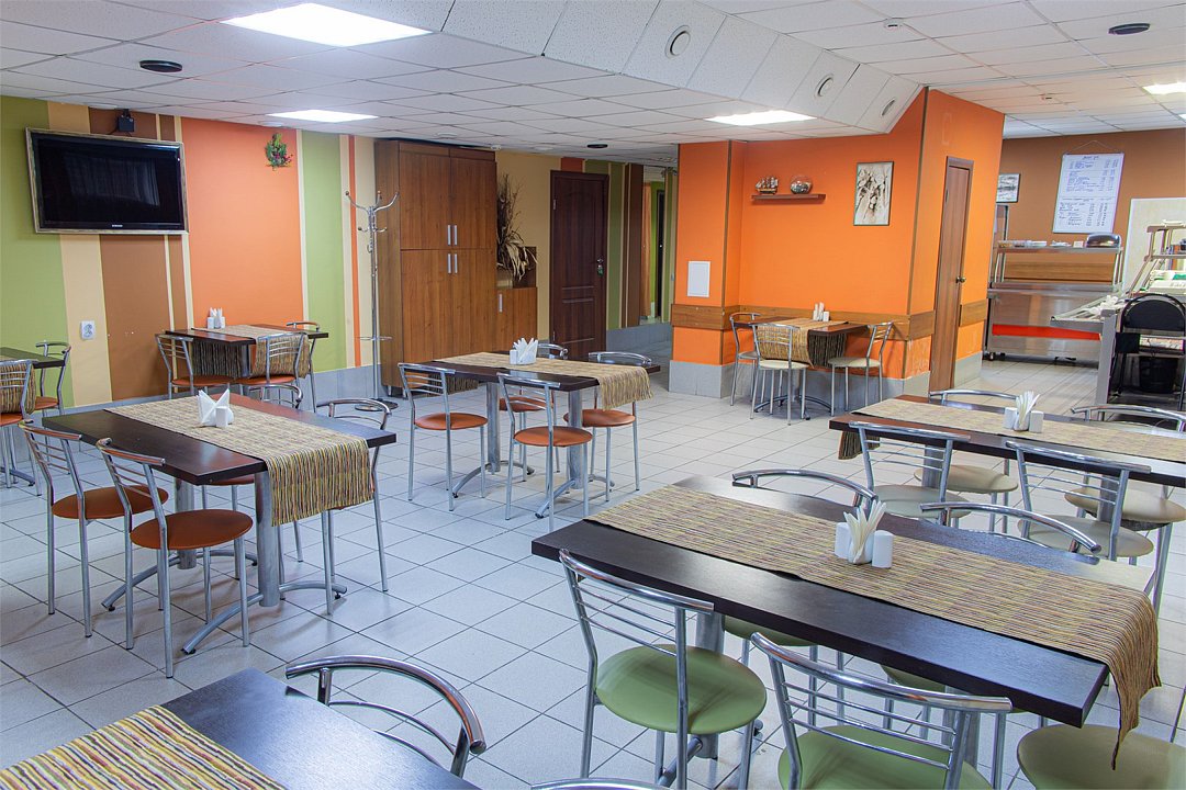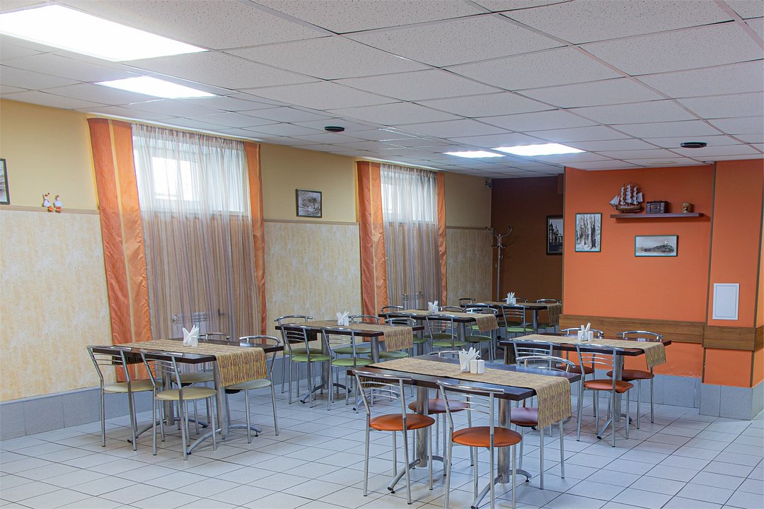- Кафе в здании. Вместимость: до 40–52 человек. Кафе–столовая русской кухни с традиционной линией раздачи с типом обслуживания из–за прилавка. Кафе предлагает в будни завтрак, обед, ужин с 08:00 до 16:00. Также по предварительному заказу формирует ужин в ланч–боксах с доставкой в номер.