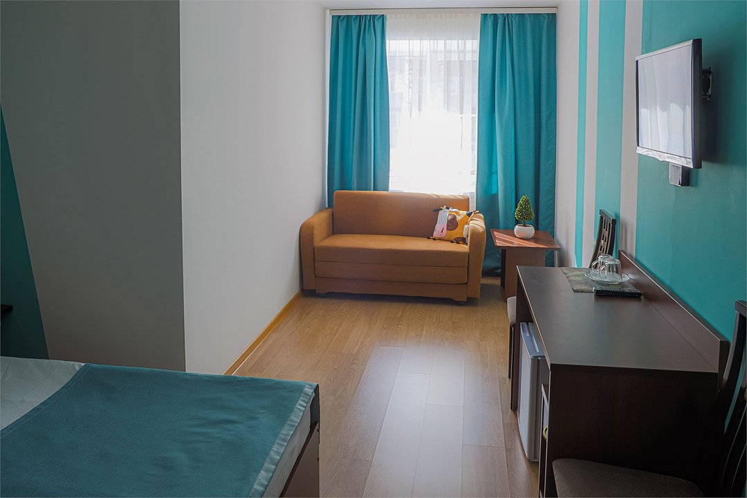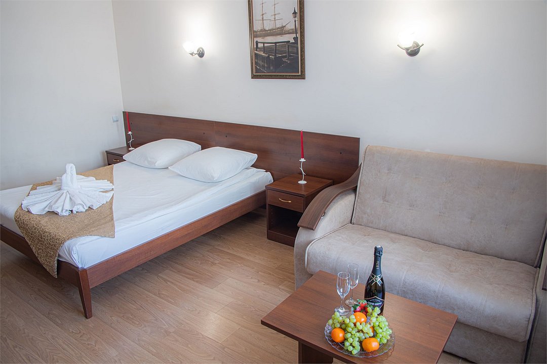Стандартный номер для отдыха семьей. Комфортная двуспальная кровать и удобный диван, который может использоваться как дополнительное спальное место.Услуги и удобства