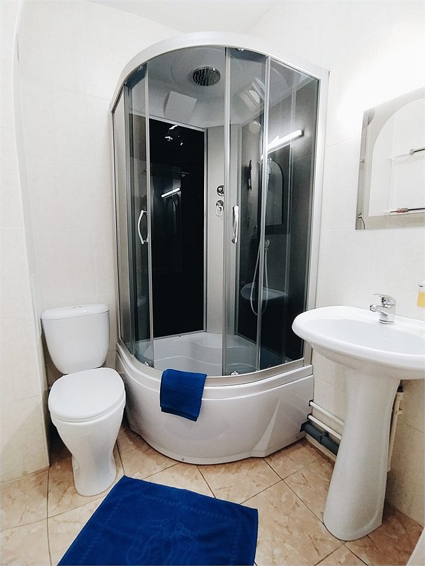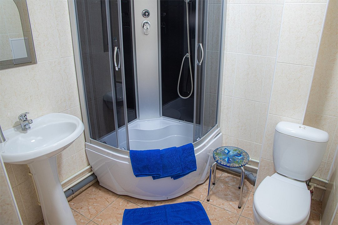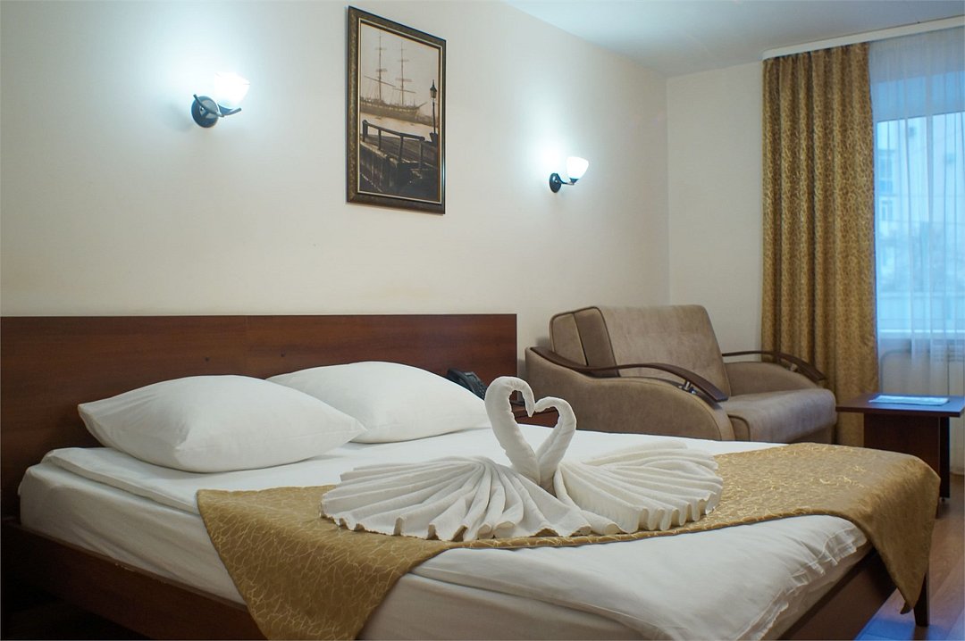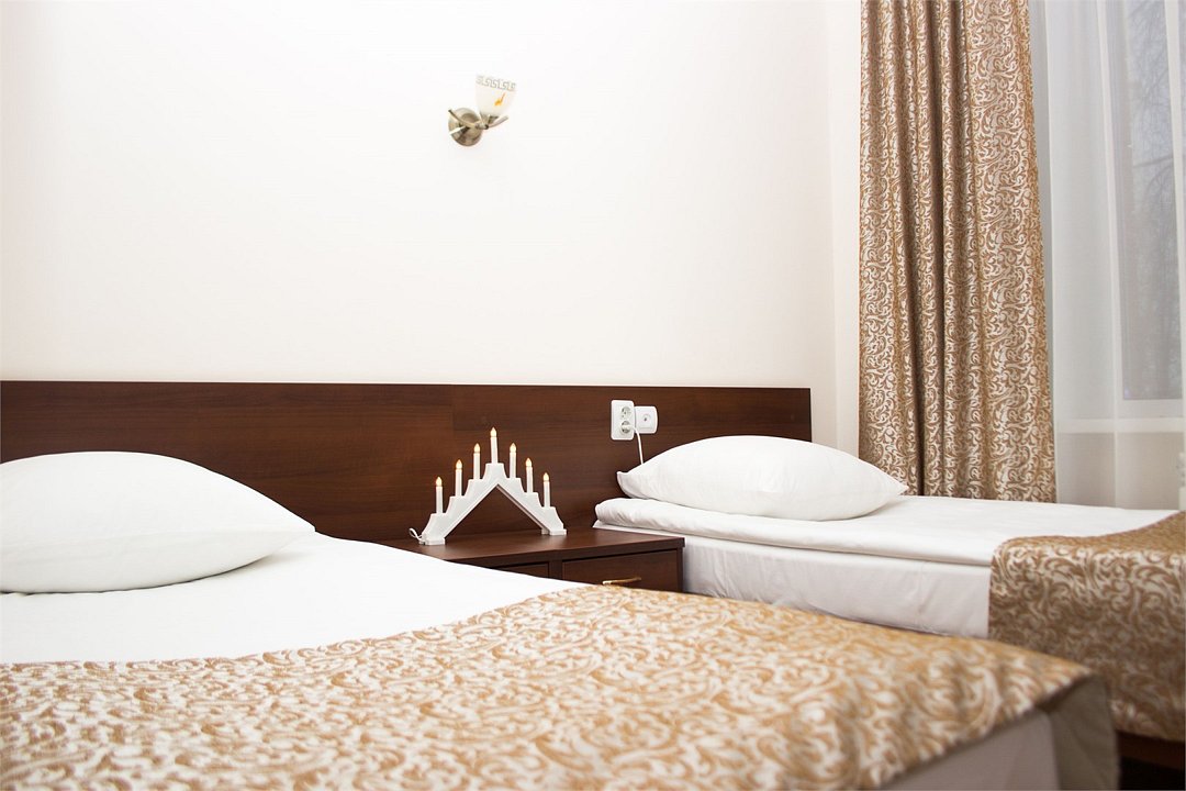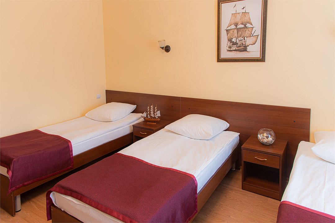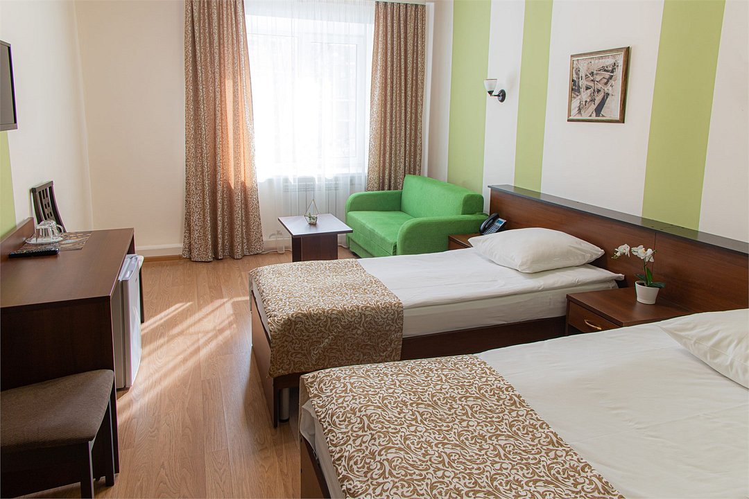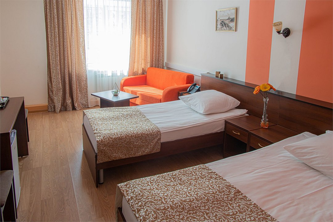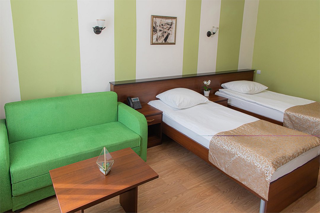 Просторный светлый номер, площадь 30 м. кв. Стандартная мебель: 3 кровати, тумбочки, стол, 2 стула, разборный французский диван, журнальный столик, шкаф-гардероб, багажница. Сан узел, душевая кабина в номере, укомплектованы полотенцами, одноразовой косметикой.Услуги и удобства
