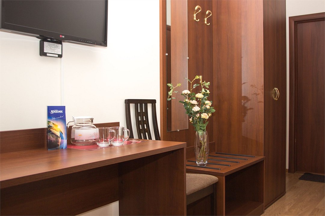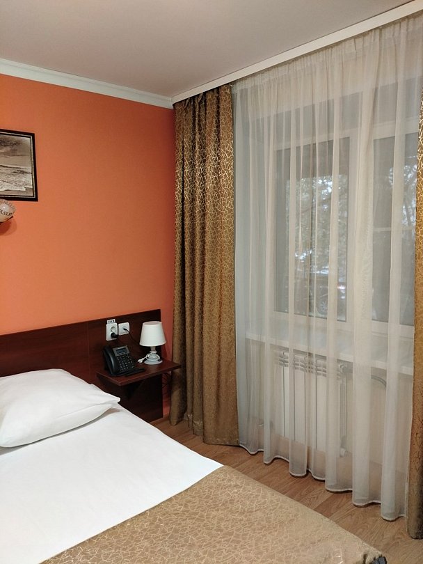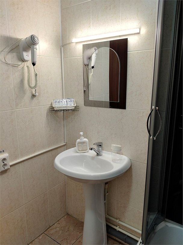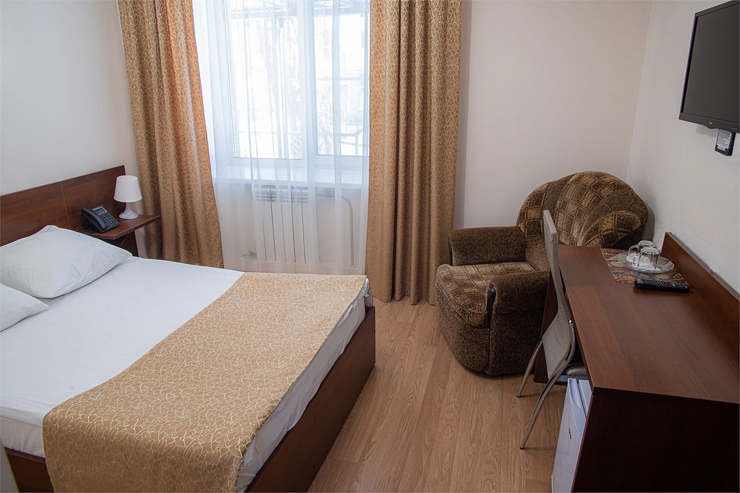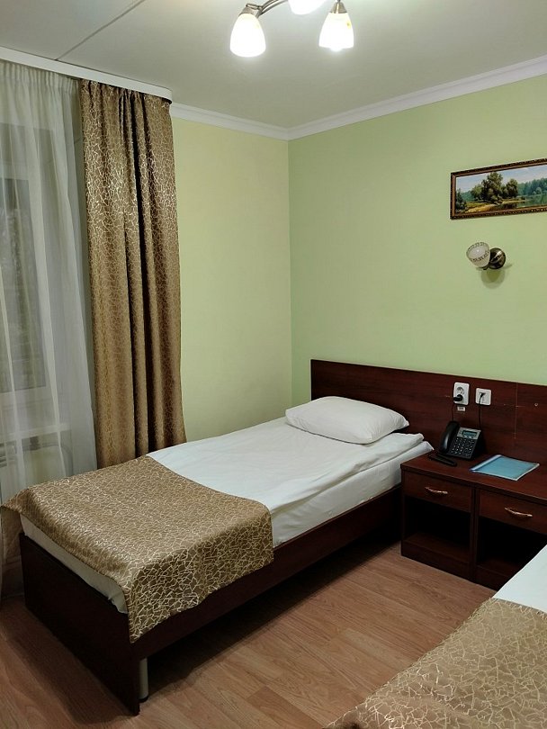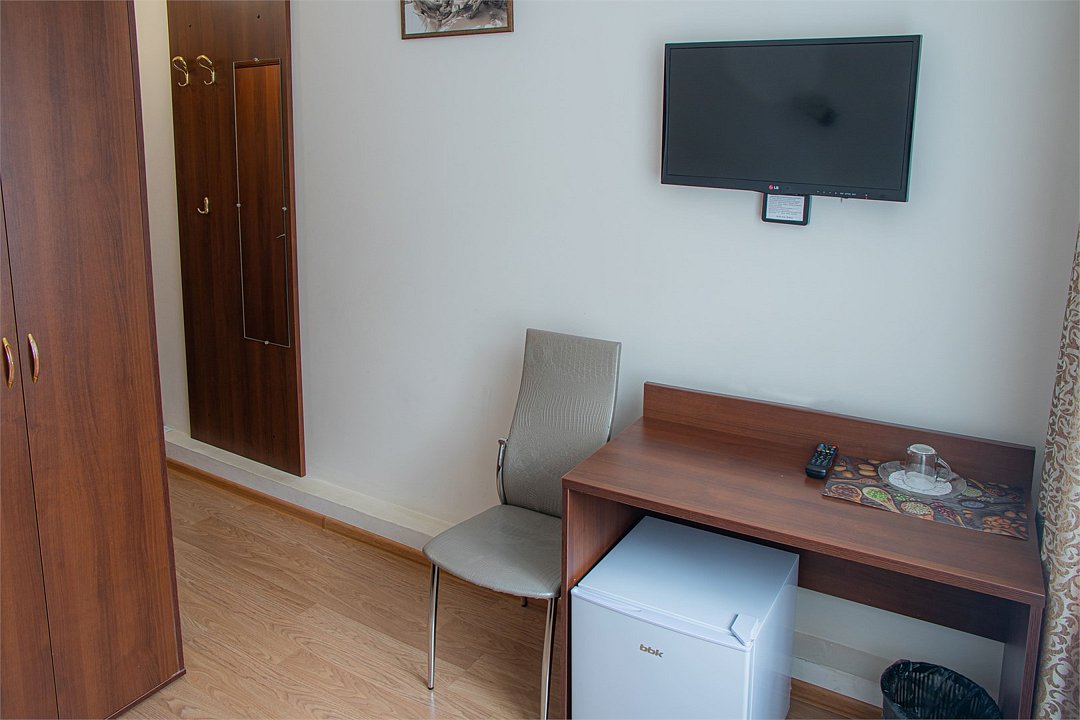 Просторный светлый номер, площадь 12 м. кв. Стандартная мебель: кроватm, тумбочкa, стол, стул, шкаф-гардероб, багажница. Сан узел, душевая кабина в номере, укомплектованы полотенцами, одноразовой косметикой.Услуги и удобства