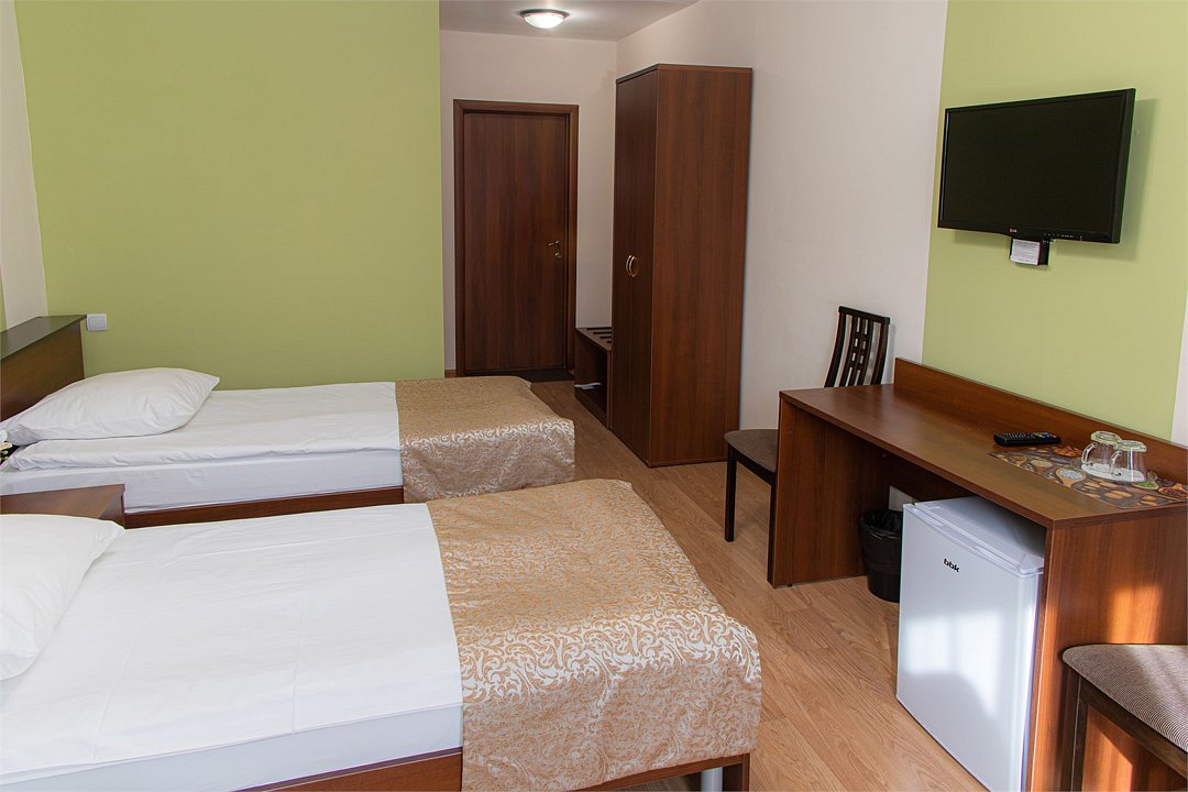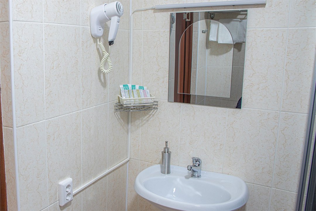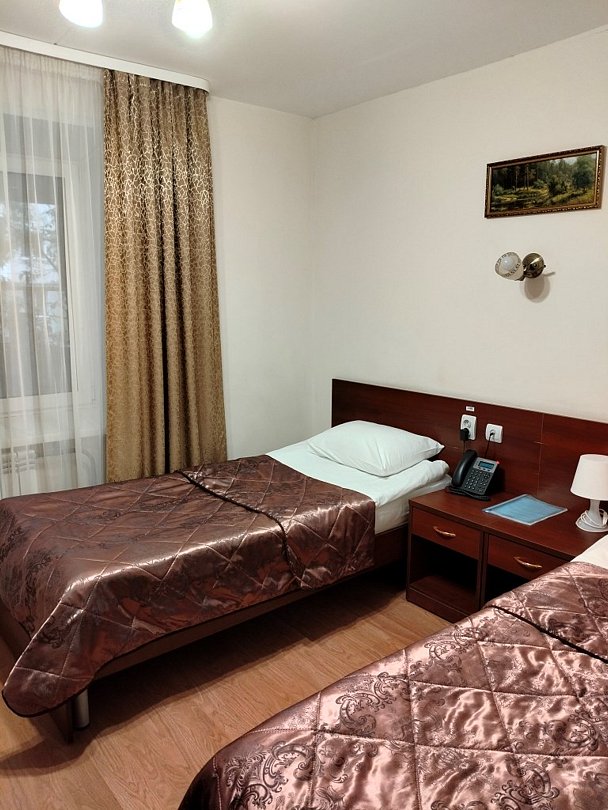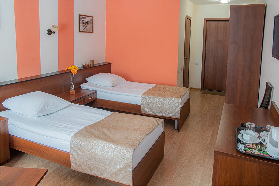 Просторный светлый номер, площадь 14 м. кв. Стандартная мебель: 2 кровати, 2 тумбочки, стол, 2 стула, шкаф-гардероб, багажница. Сан узел, душевая кабина в номере, укомплектованы полотенцами, одноразовой косметикой.Услуги и удобства