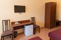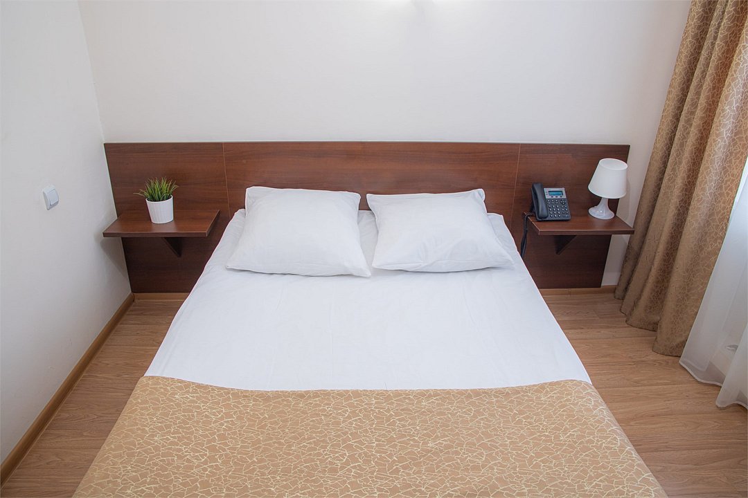 Просторный светлый номер, площадь 14 м. кв. Стандартная мебель: двухспальная кровать, 2 тумбочки, стол, 2 стула, шкаф-гардероб, багажница. Сан узел, душевая кабина в номере, укомплектованы полотенцами, одноразовой косметикой.Услуги и удобства