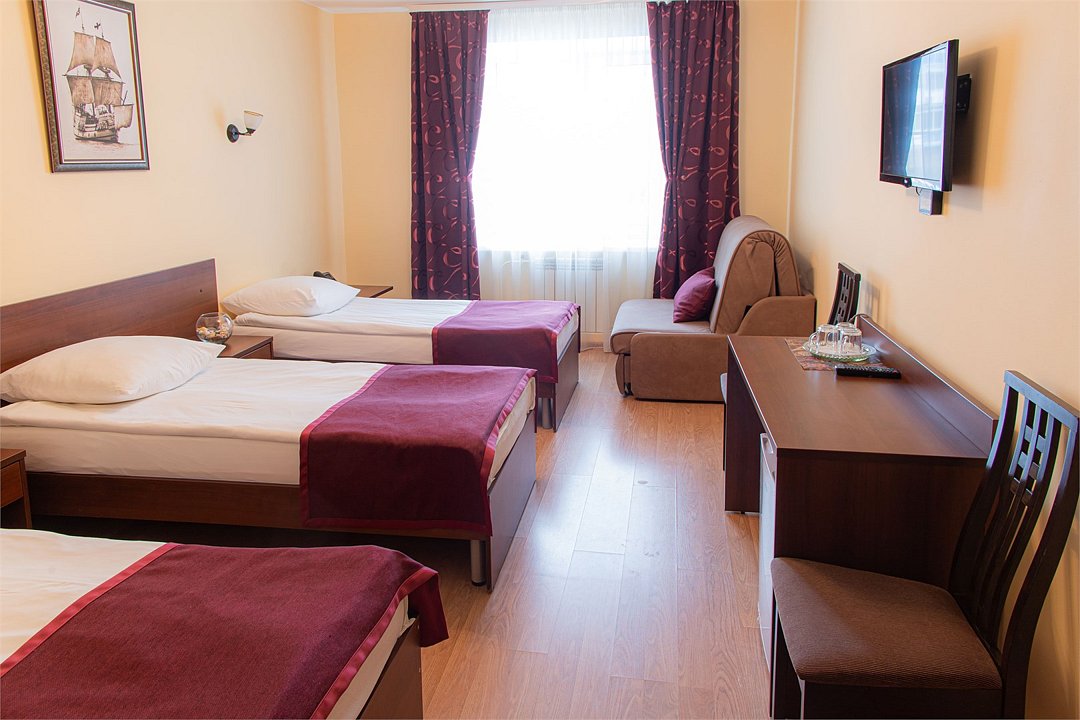Стандартный номер, 21 кв. м. Три кровати, диван, который может служить спальным местом. Рабочий стол, стулья, тумбочки.Услуги и удобства