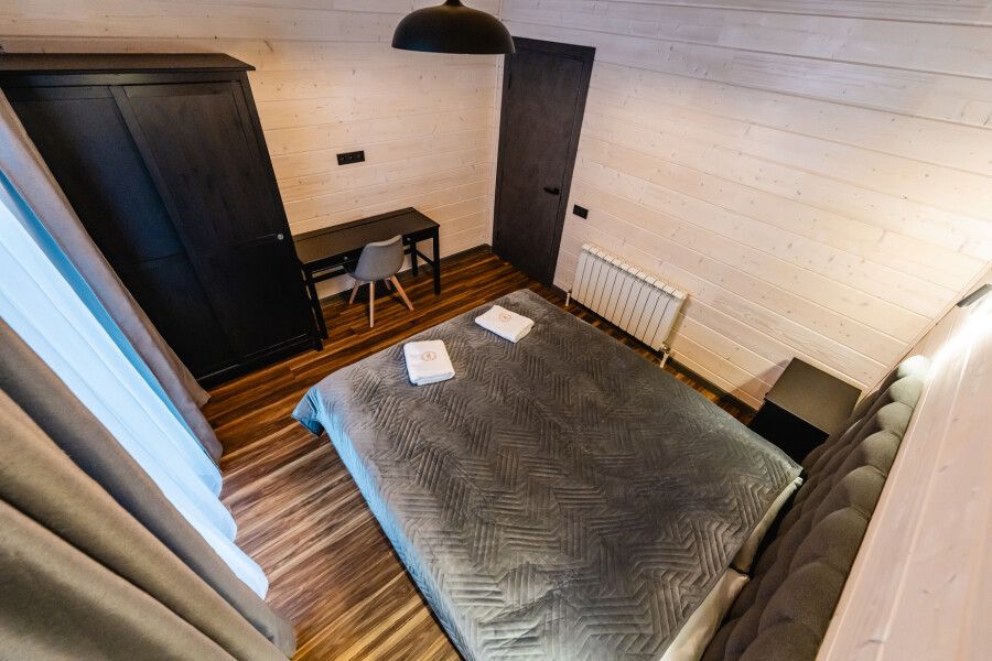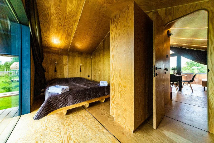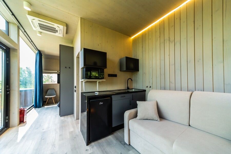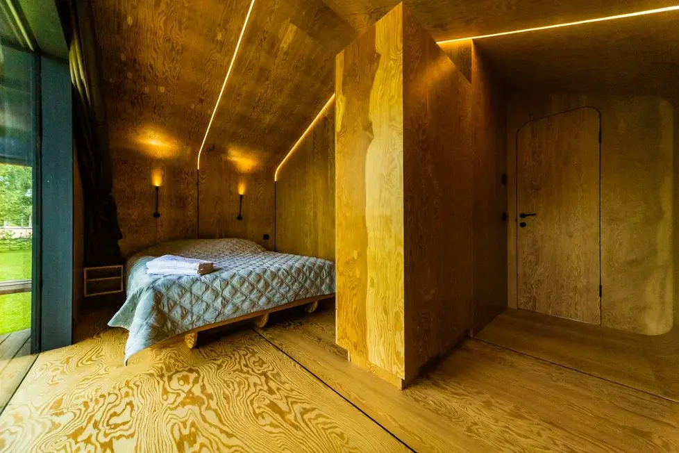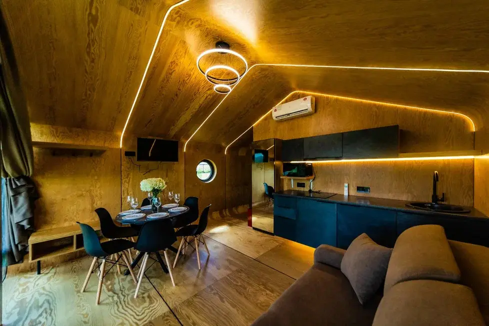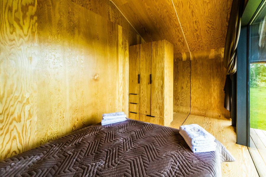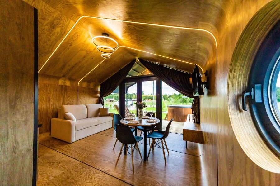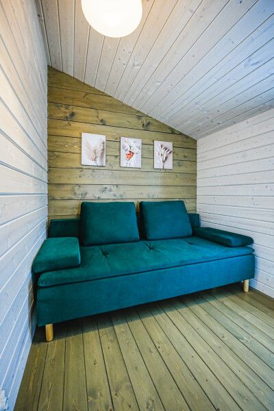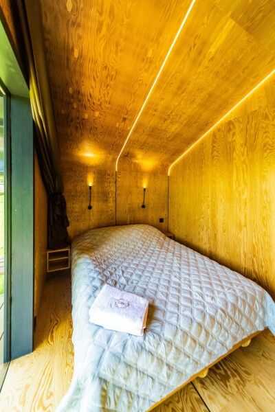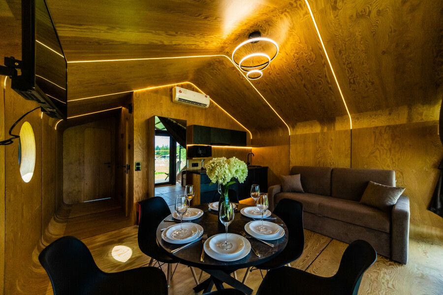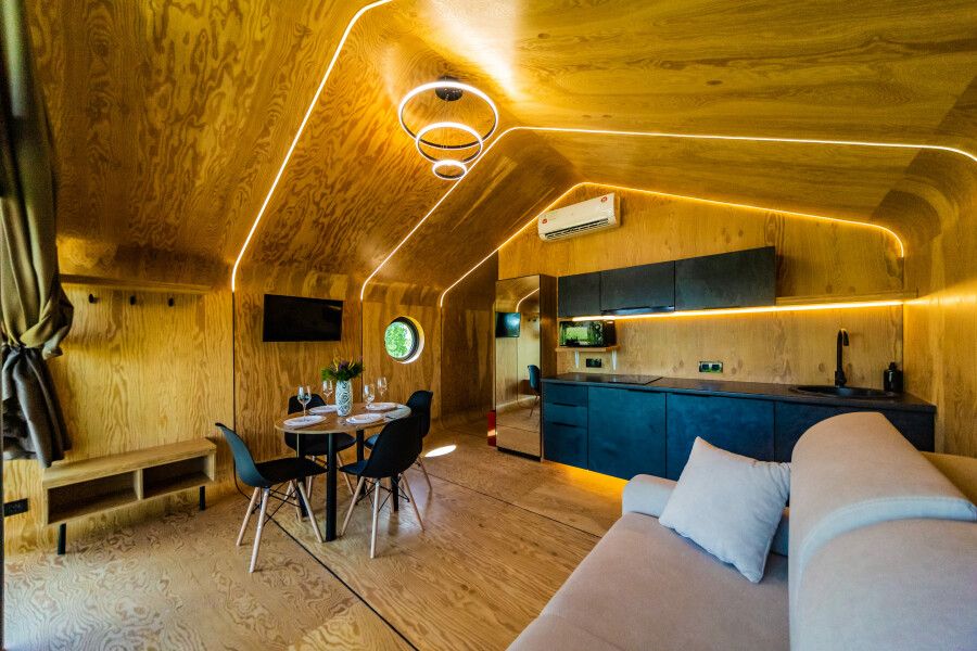 В модуле 2 основных места и 2 дополнительных. Тепло дерева и натуральных тканей помогли создать гармоничное и уютное пространство, где можно наслаждаться покоем в единении с собой, с любимым человеком или семьей.