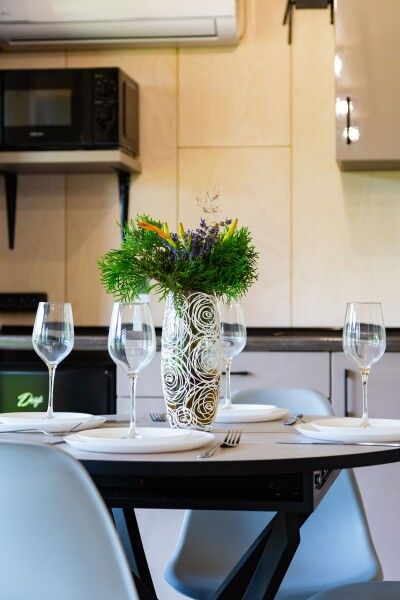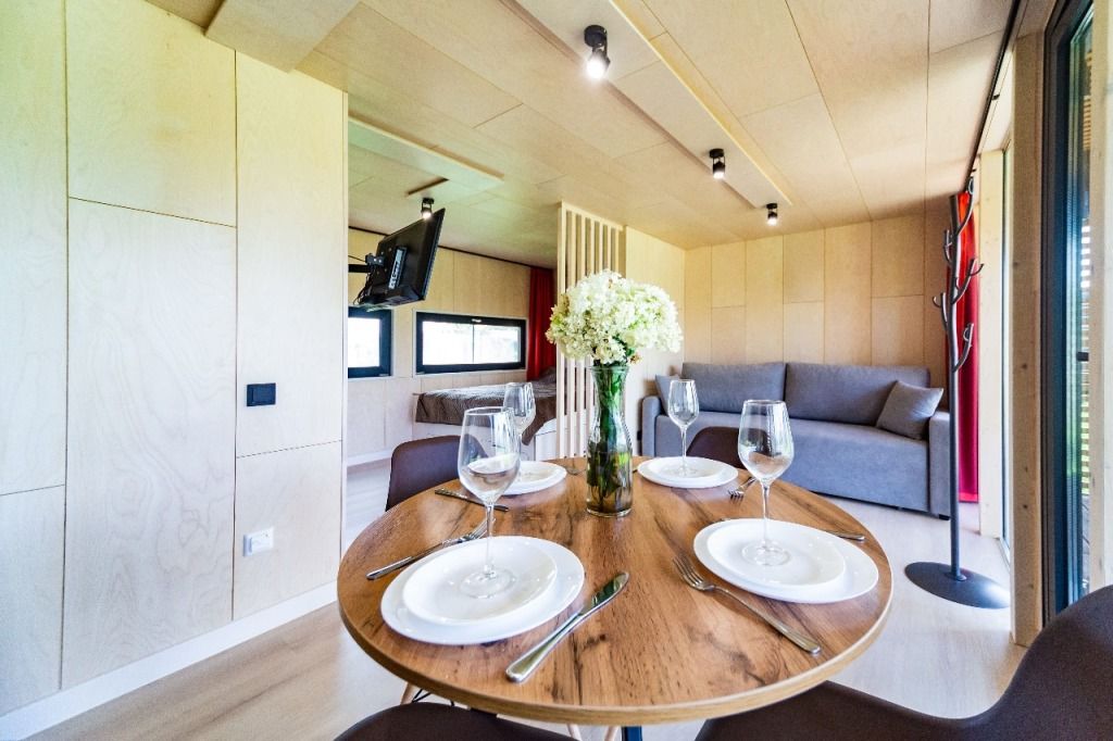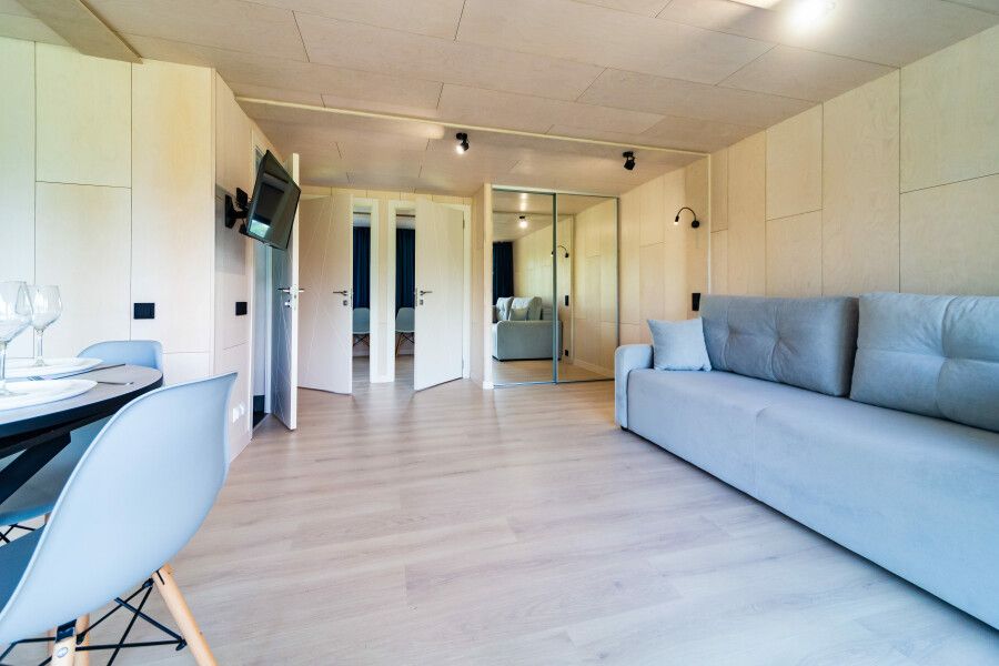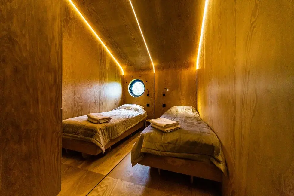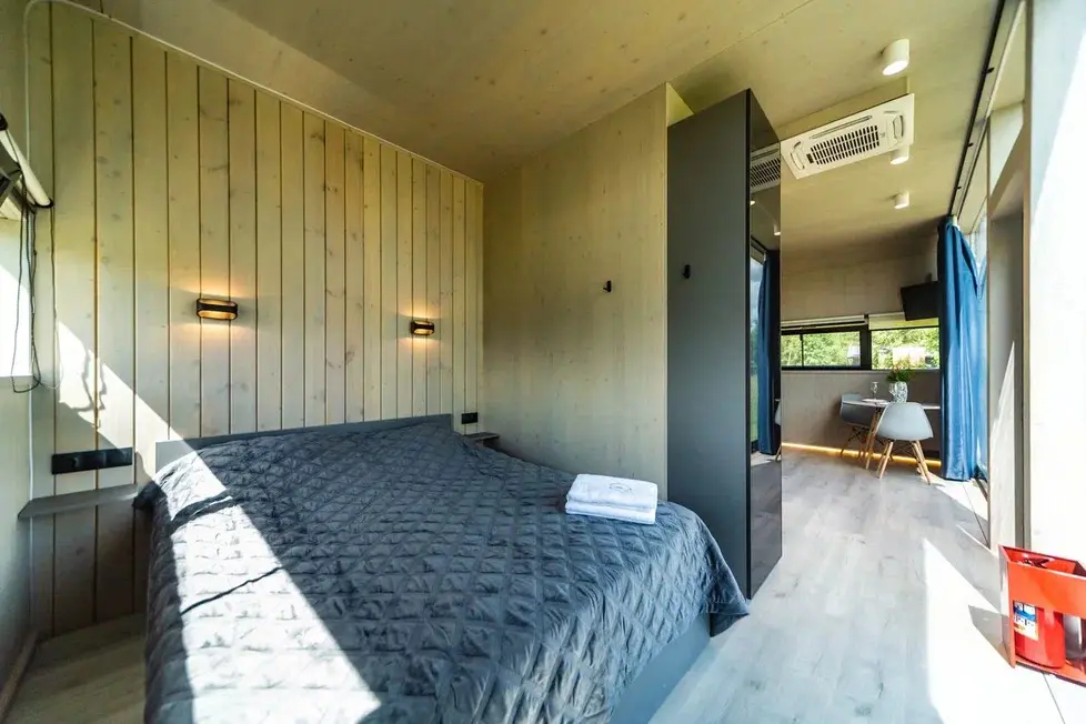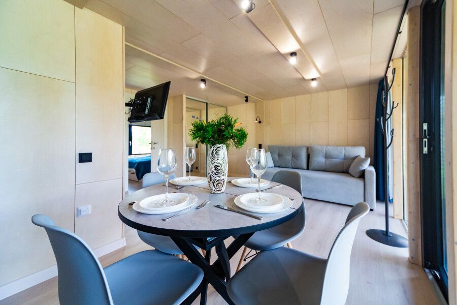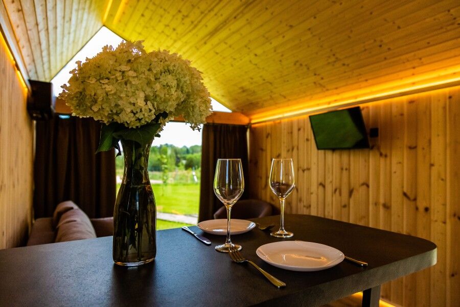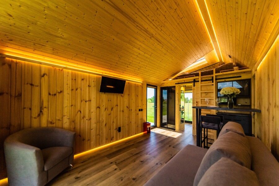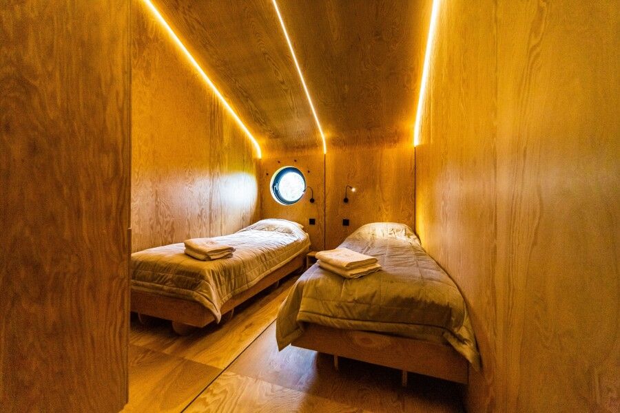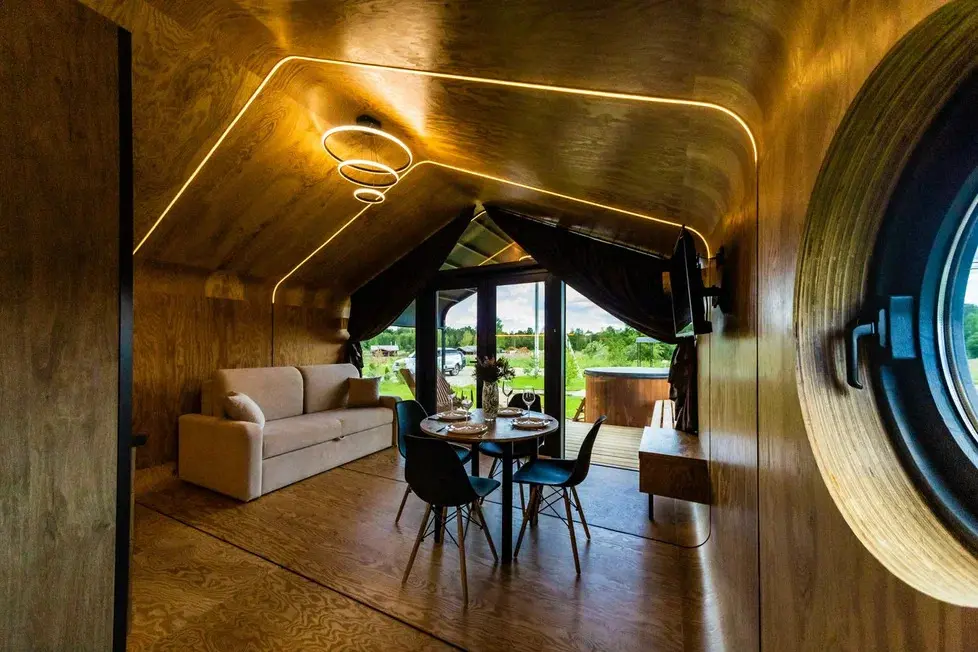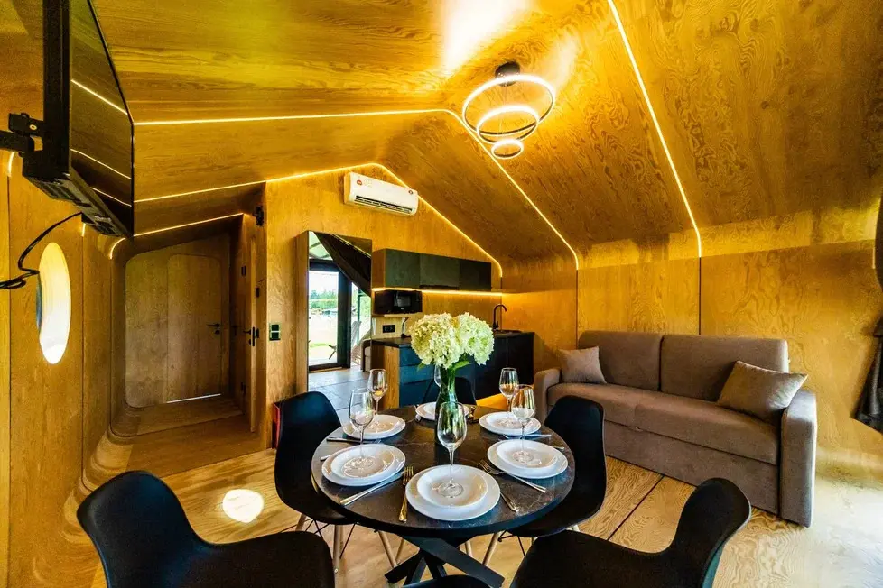 В модуле 2 основных места и 2 дополнительных. Тепло дерева и натуральных тканей помогли создать гармоничное и уютное пространство, где можно наслаждаться покоем в единении с собой, с любимым человеком или семьей.