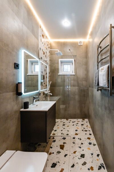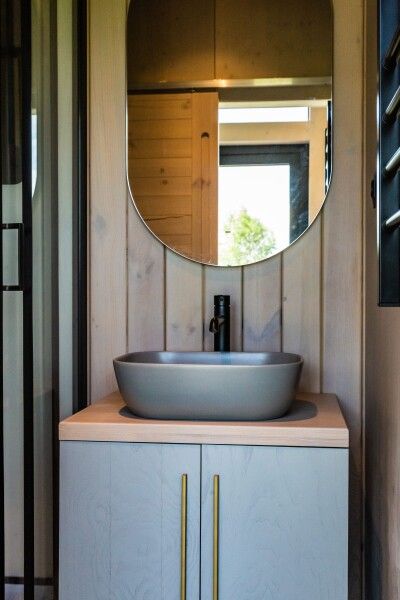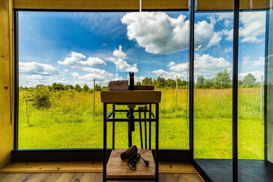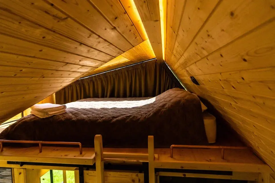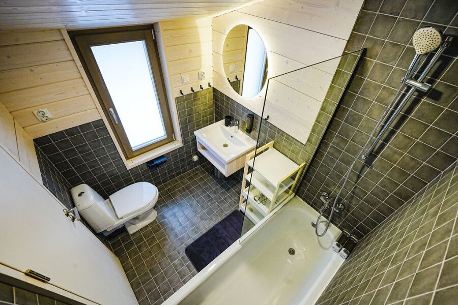 Главная особенность — ванная с панорамными окнами. Представьте: вы принимаете ванну и любуетесь закатом, а потом, устроившись на антресоли с большим матрасом (160×200), наблюдаете за звёздным небом, не вставая с постели.