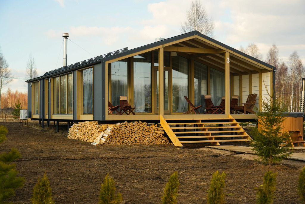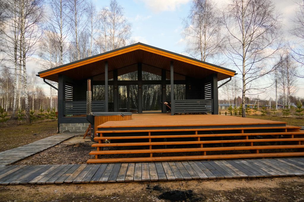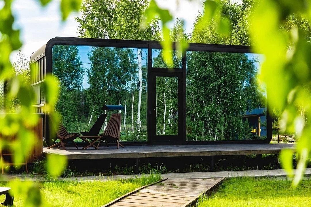 Дизайнерский одноэтажный дом с террасой-палубой и панорамными окнами. В доме: кухня с техникой и посудой, гостиная с диваном-кроватью, журнальным столом и оборудованной кухней, три отдельных спальни с двуспальными и односпальными кроватями и два санузла.