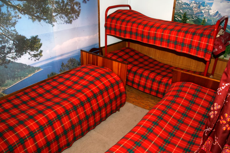 Летняя четырехместная комната с одной двухэтажной кроватью и двумя односпальными кроватями. В комнате есть окно с москитной сеткой, обогреватель, стулья, рабочий стол.