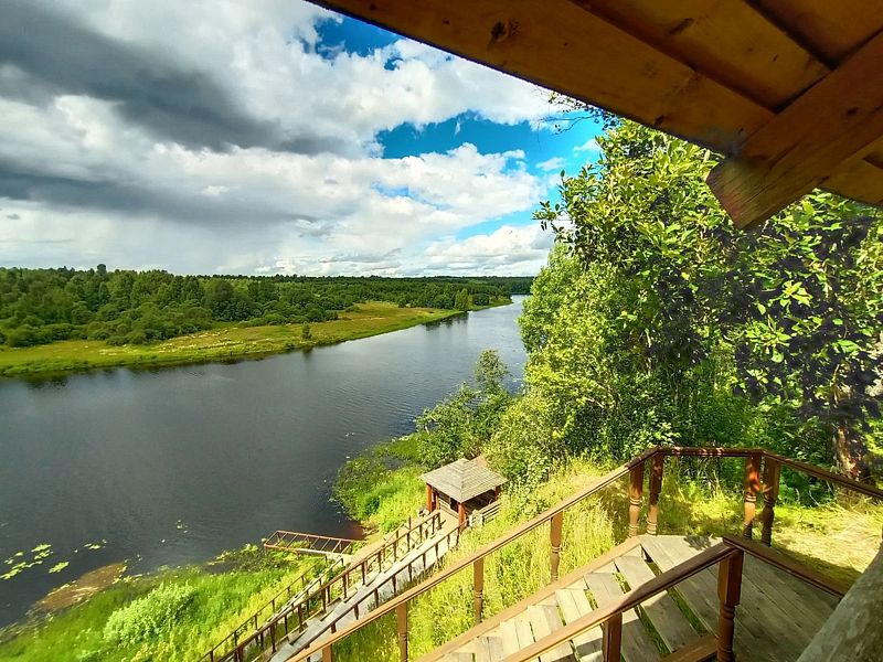 Просторный четырехкомнатный коттедж с огромной террасой, расположенной в лесу с видом на реку Сить.