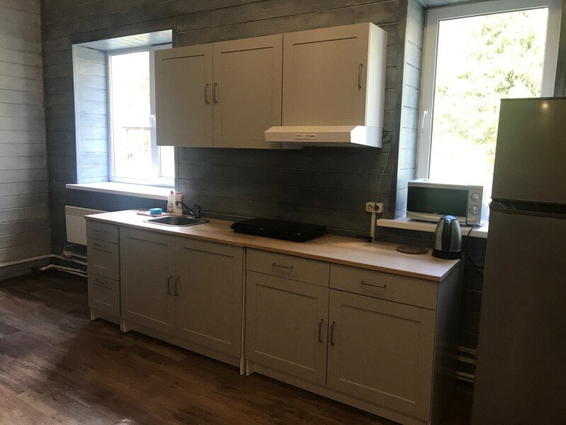 В коттедже располагаются: две спальные, оборудованная кухня-гостиная с необходимым набором посуды для сервировки и приготовления, большим холодильником, плитой, СВЧ, обеденной зоной и зоной отдыха с диваном и спутниковым телевидением, санузел и прихожая.