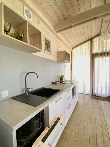 В коттедже располагаются одна просторная спальня с гостевой зоной, оборудованная кухня-гостиная с необходимым набором посуды для сервировки и приготовления, большим холодильником, плитой, СВЧ и посудомоечной машиной, обеденной зоной и зоной отдыха с диваном и спутниковым телевидением, также есть комната с душем и санузлом и прихожая.