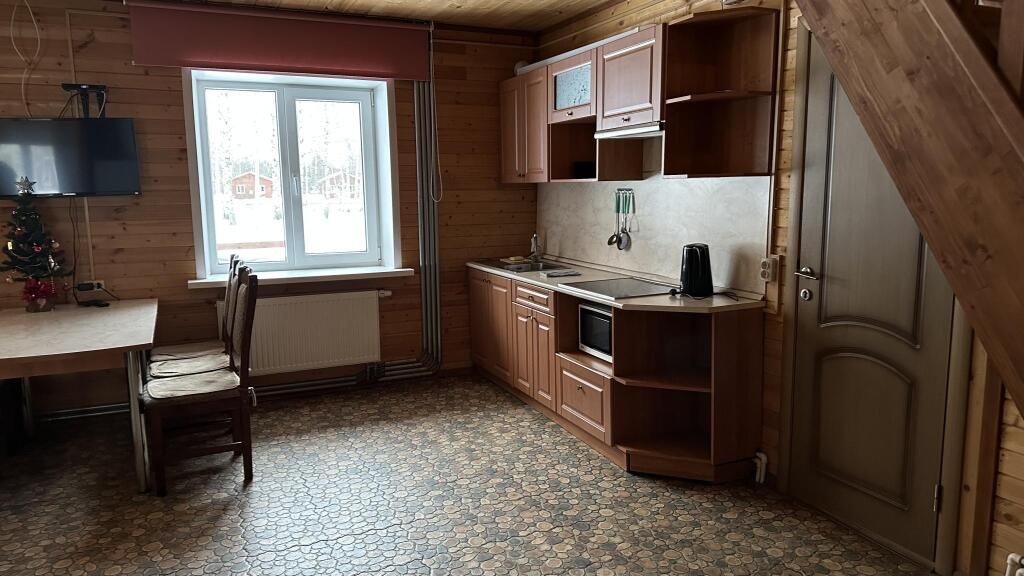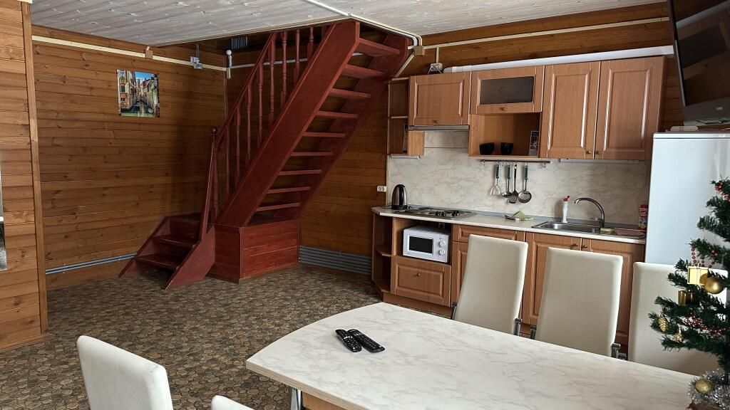 На первом этаже номера расположена просторная оборудованная кухня-гостиная. В гостиной есть 2-х спальный раскладной диван и телевизор.