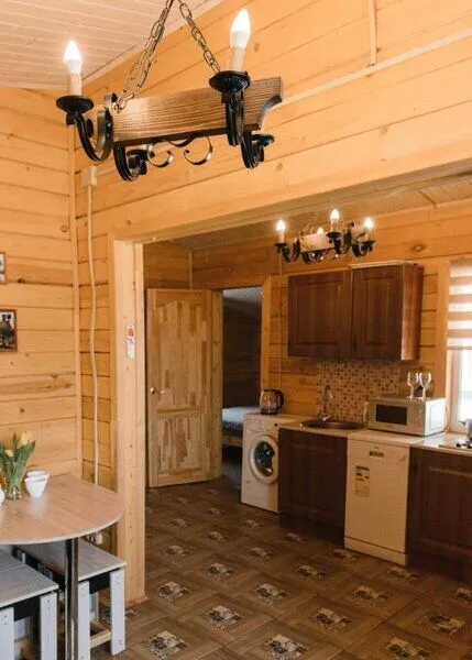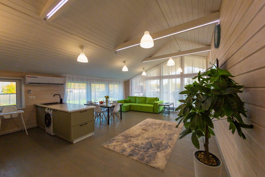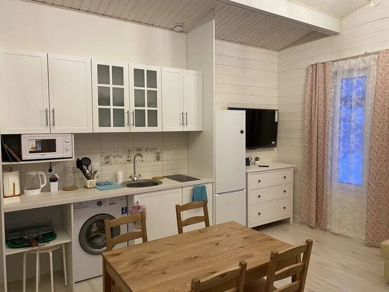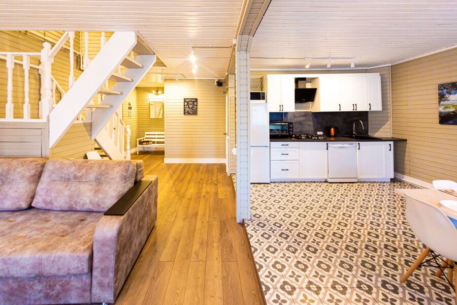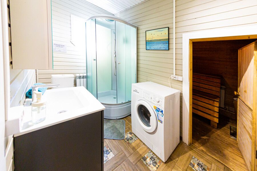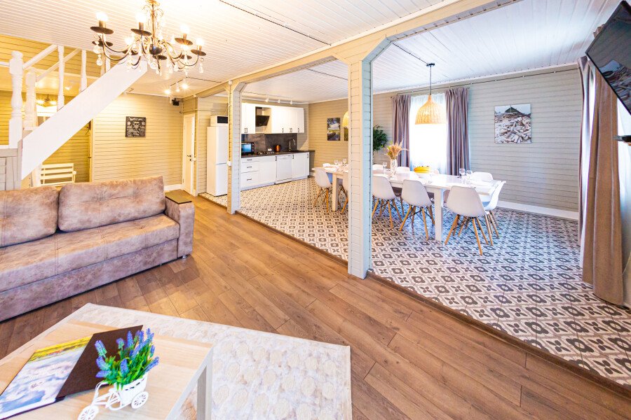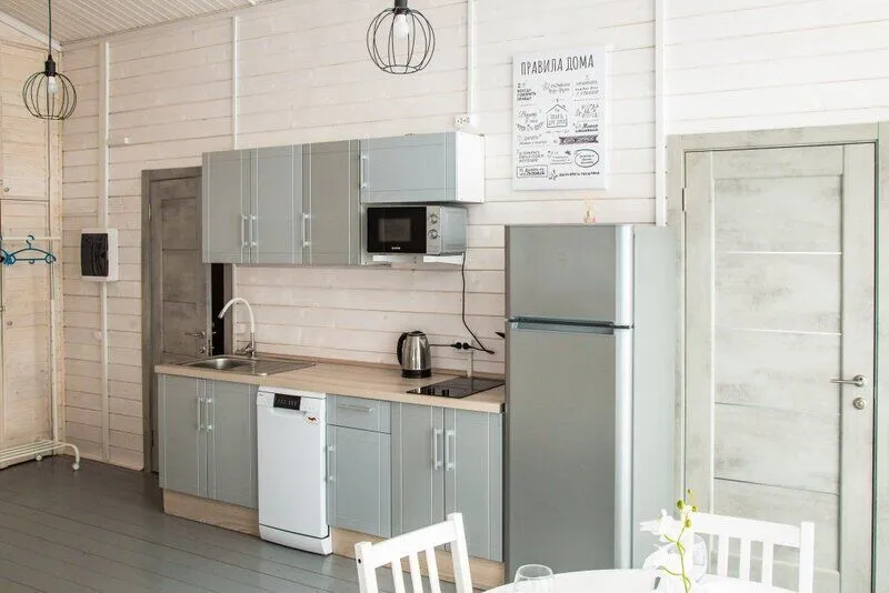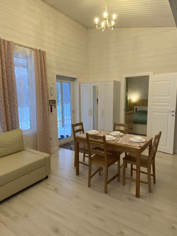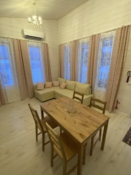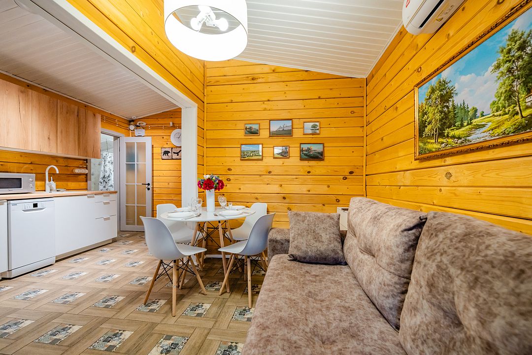 В доме — 2 спальни с удобными двуспальной и односпальными кроватями и гостиная с большим диваном, где смогут разместиться в общей сложности до 6 человек. Оборудованная кухня со всей необходимой техникой (холодильник, плита, посудомоечная машина, микроволновая печь, чайник) и полным набором посуды. В гостиной — смарт-ТВ. Бесплатный интернет через Wi-Fi. В доме есть санузел и финская сауна!