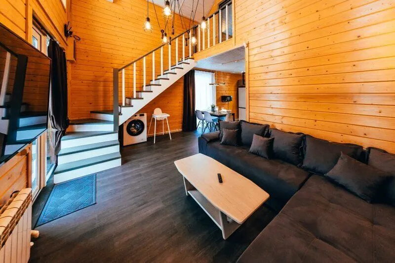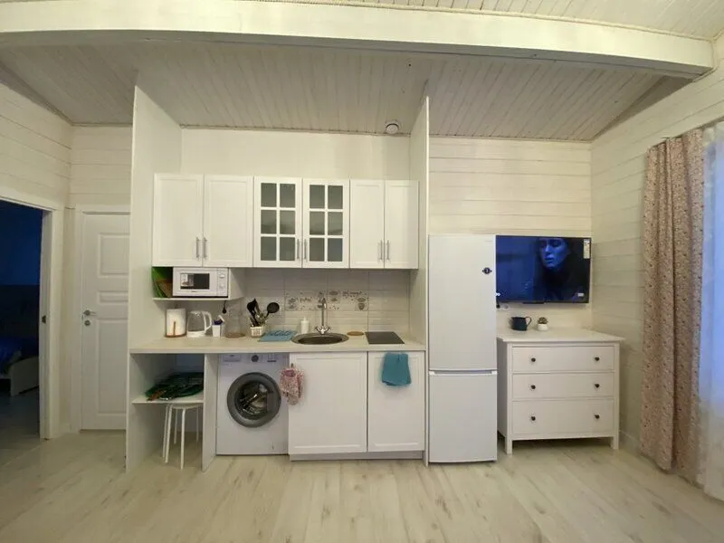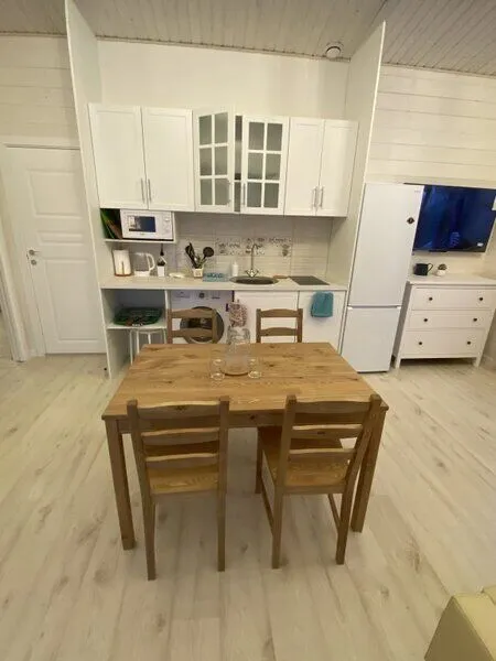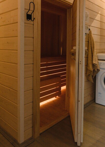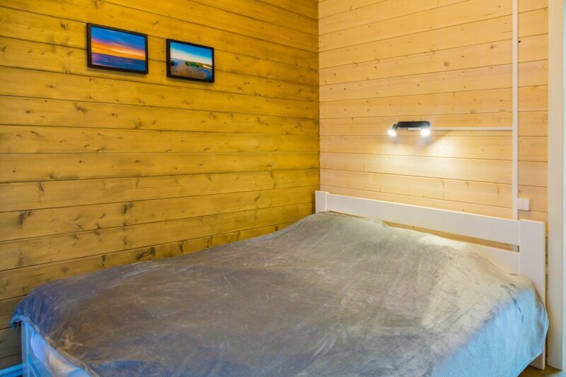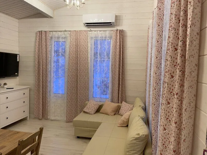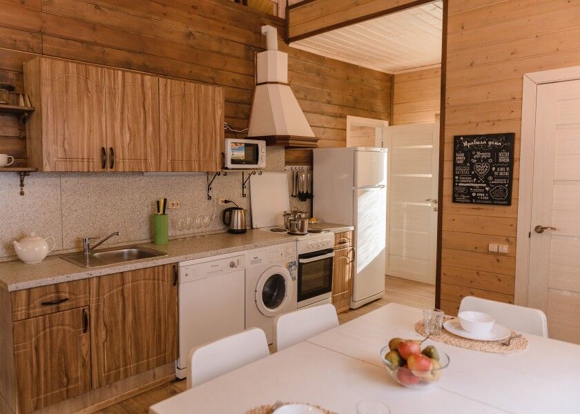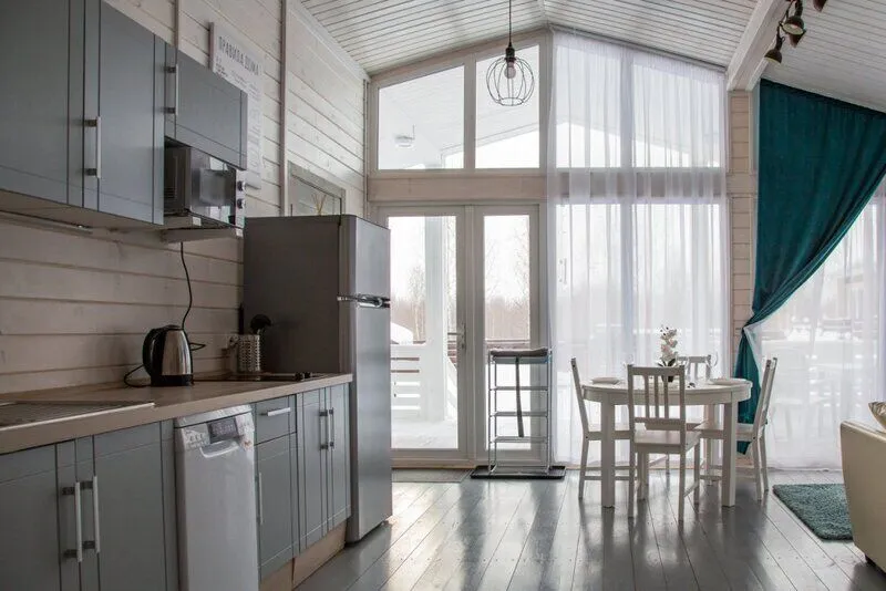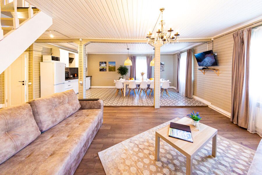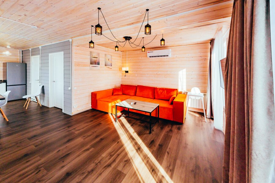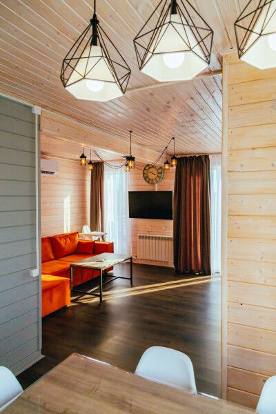 В доме — 2 спальни с удобными двуспальной и односпальными кроватями и гостиная с большим диваном, где смогут разместиться в общей сложности до 6 человек. Оборудованная кухня со всей необходимой техникой (холодильник, плита, посудомоечная машина, микроволновая печь, чайник) и полным набором посуды. В гостиной — смарт-ТВ. Бесплатный интернет через Wi-Fi. В доме есть санузел и финская сауна!