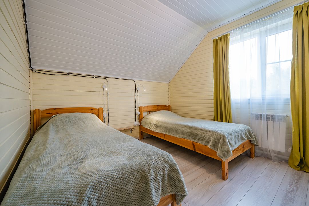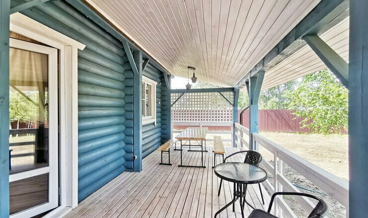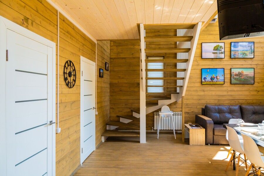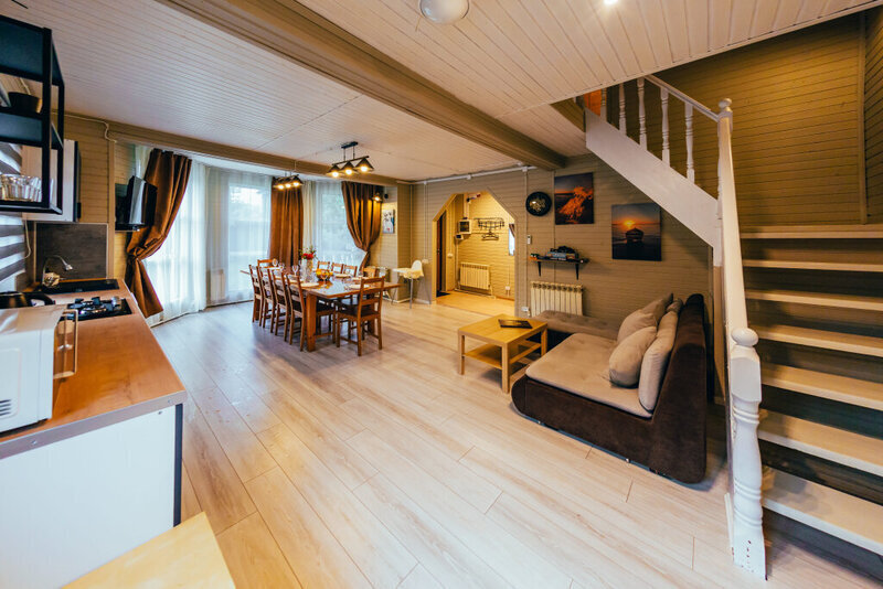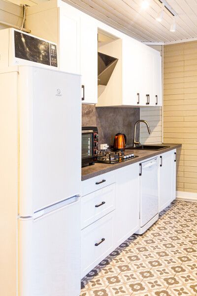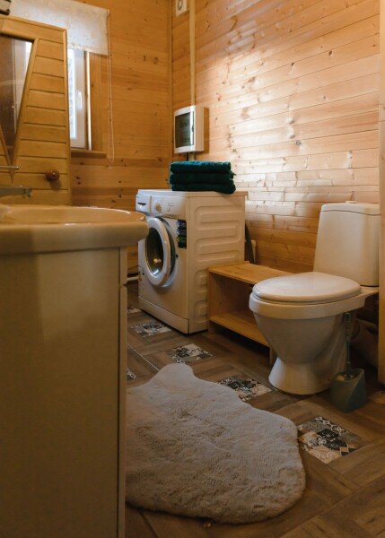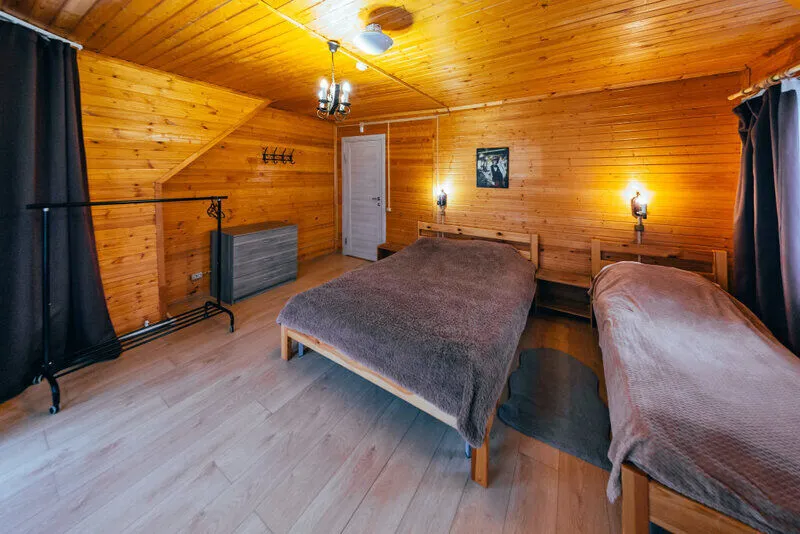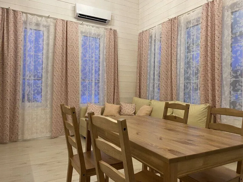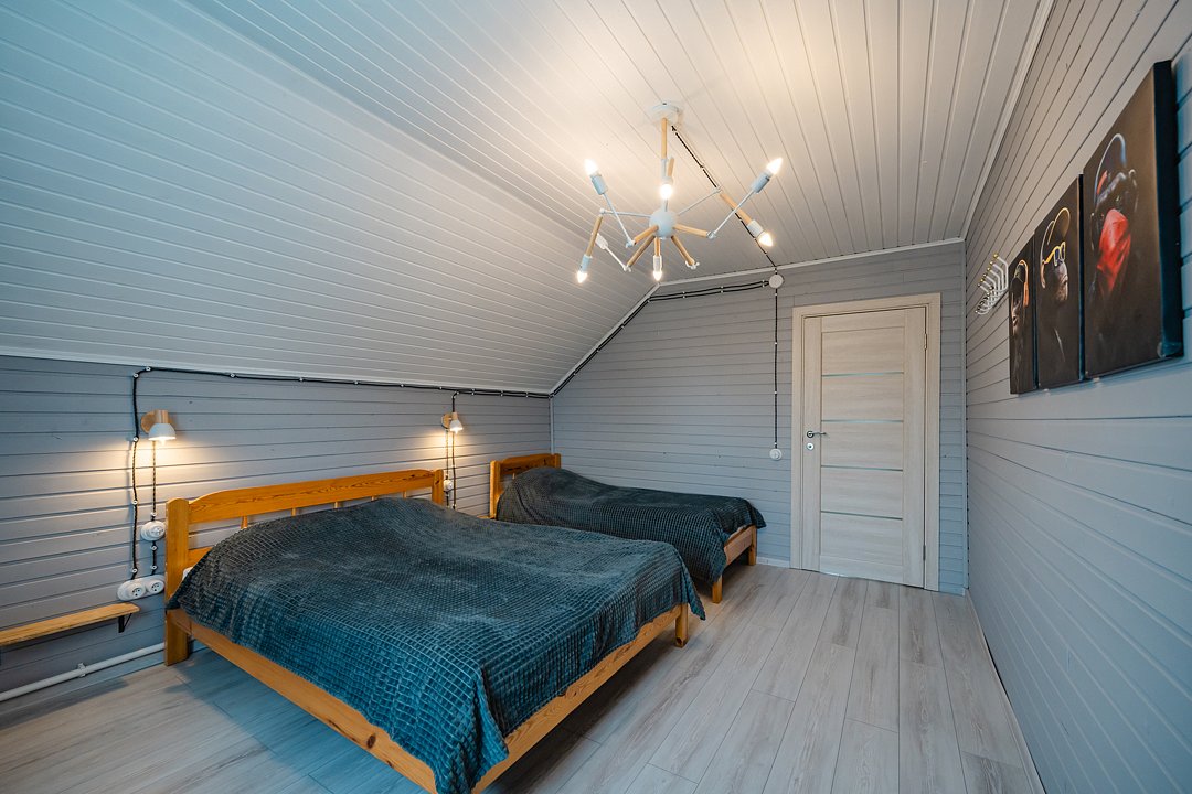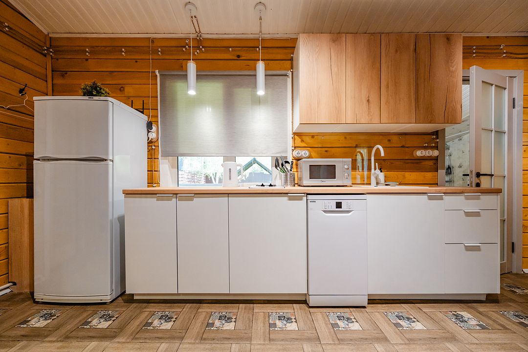В доме — 2 спальни с удобными двуспальной и односпальными кроватями и гостиная с большим диваном, где смогут разместиться в общей сложности до 6 человек. Оборудованная кухня со всей необходимой техникой (холодильник, плита, посудомоечная машина, микроволновая печь, чайник) и полным набором посуды. В гостиной — смарт-ТВ. Бесплатный интернет через Wi-Fi. В доме есть санузел и финская сауна!