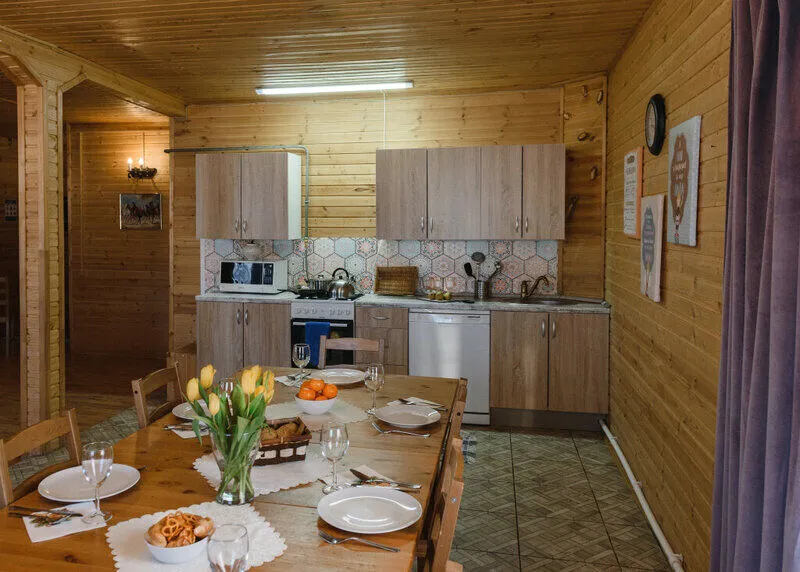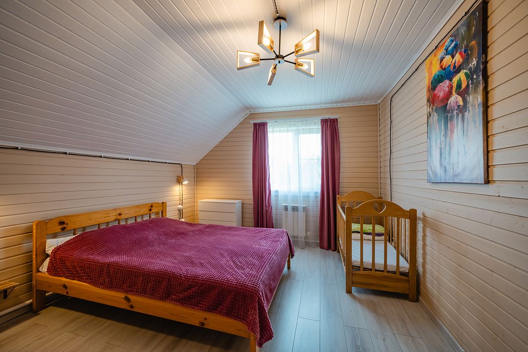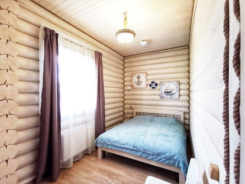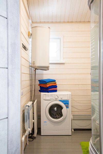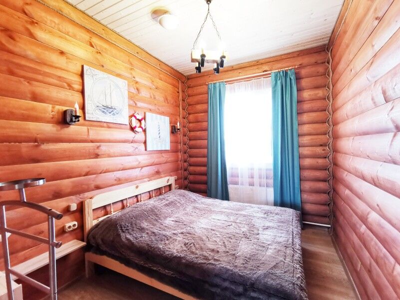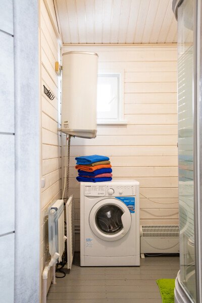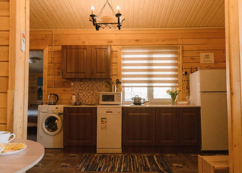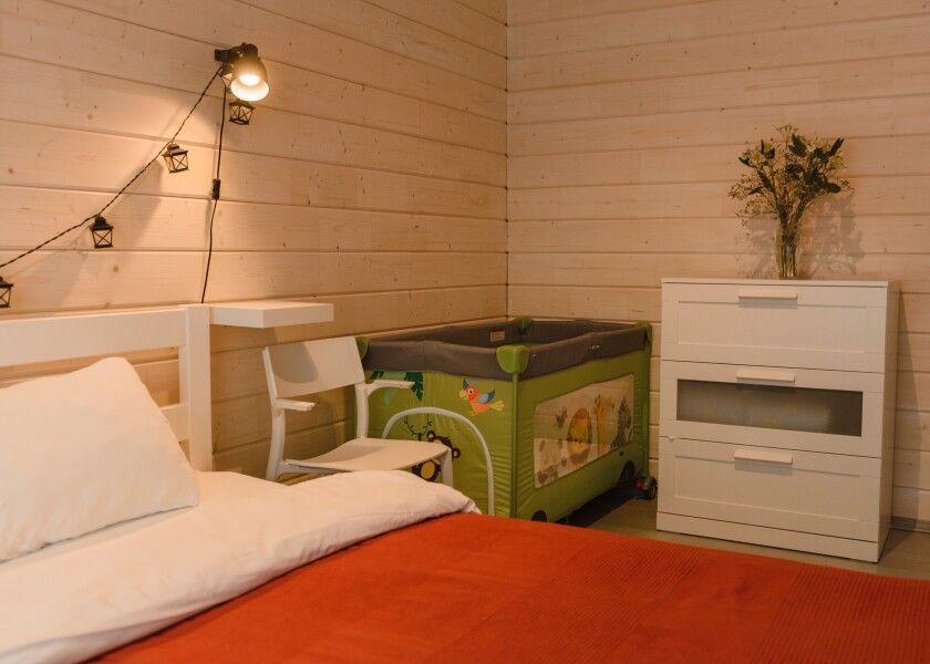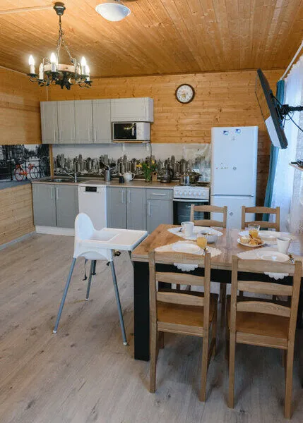 В доме — 1 спальня с удобной двуспальной кроватью, спальным детским манежем и гостиная с диваном, где смогут разместиться в общей сложности до 4 человек. Оборудованная кухня со всей необходимой техникой (холодильник, плита, посудомоечная машина, микроволновая печь, чайник) и полным набором посуды. В гостиной спутниковое ТВ. Бесплатный интернет через Wi-Fi. В доме есть санузел и финская сауна!