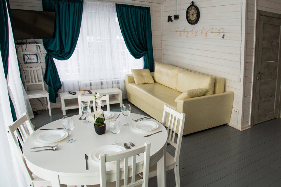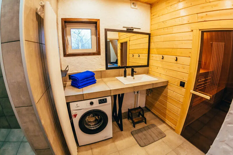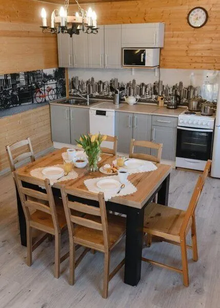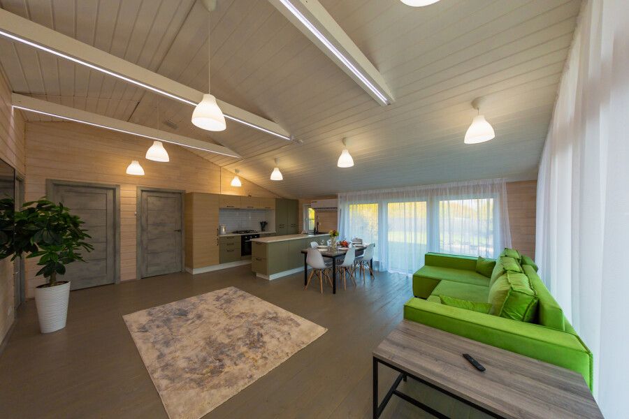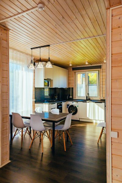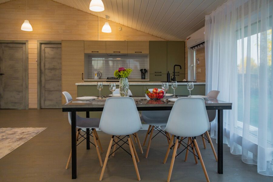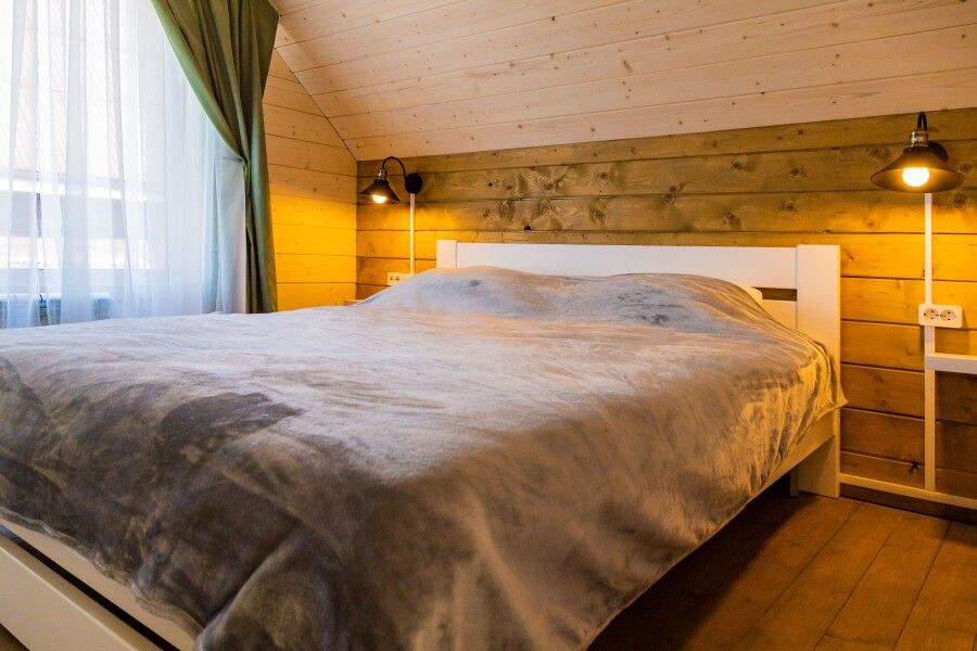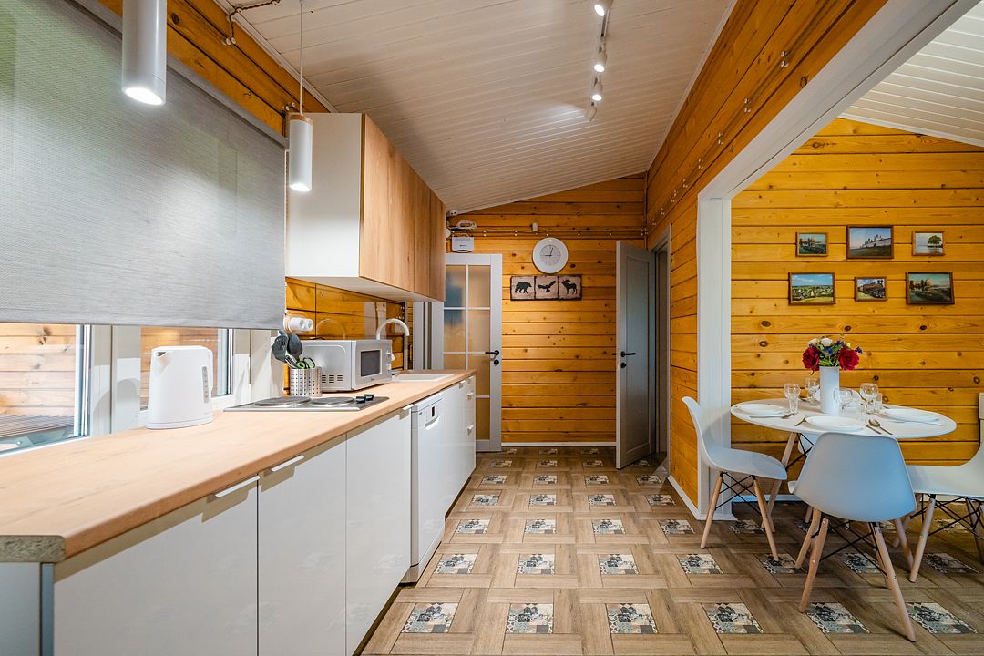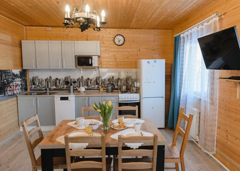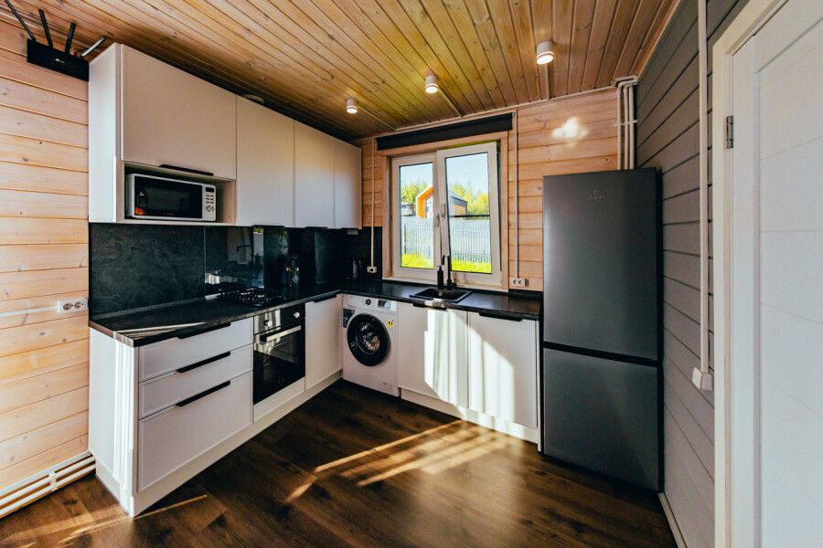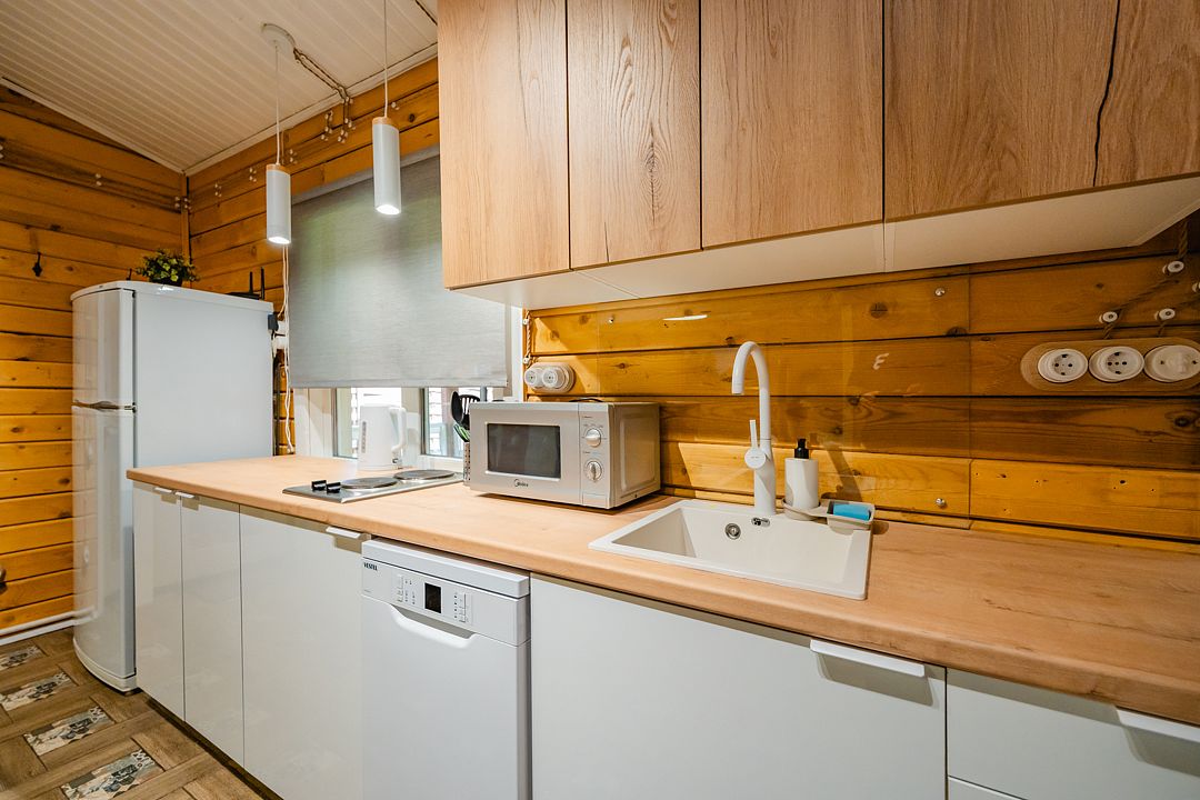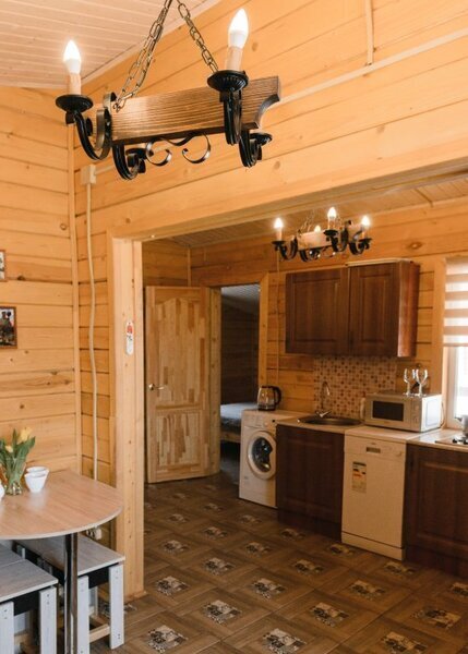 В доме — 2 спальни с удобными двуспальными кроватями и гостиная с диваном, где смогут разместиться в общей сложности до 6 человек. Оборудованная кухня со всей необходимой техникой (холодильник, плита, посудомоечная машина, микроволновая печь, чайник) и полным набором посуды. В гостиной — СМАРТ ТВ. Бесплатный интернет через Wi-Fi. В доме есть санузел и финская сауна!