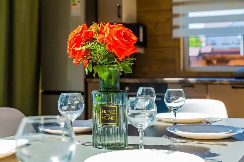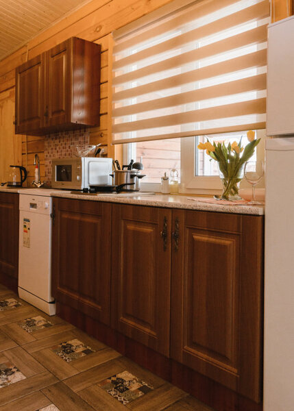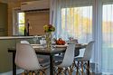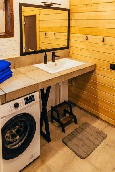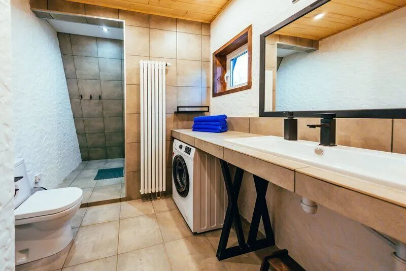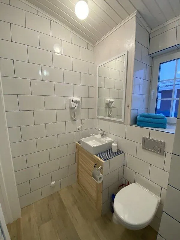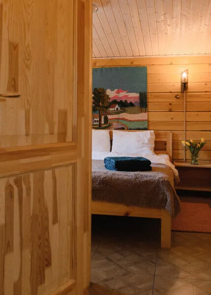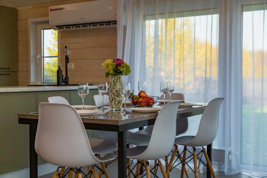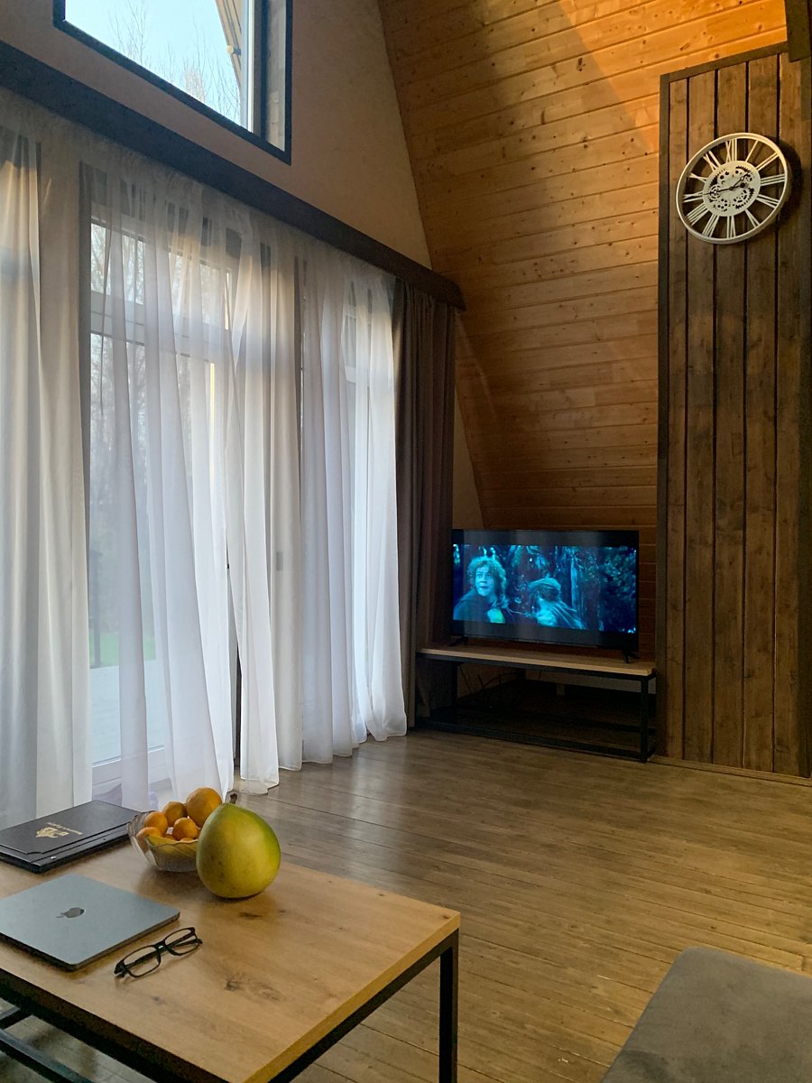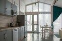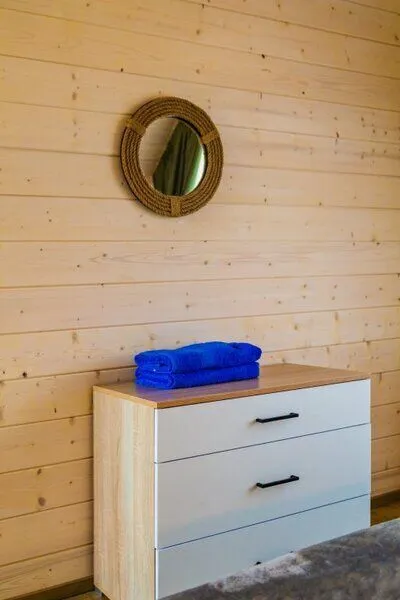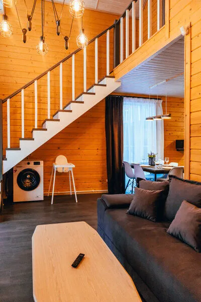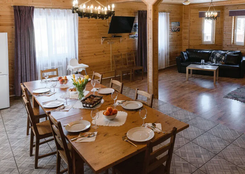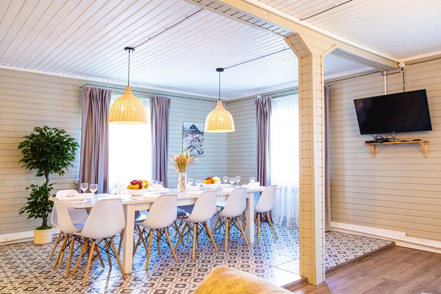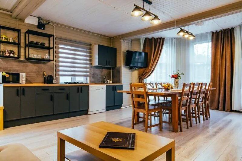 В доме — 2 спальни с удобными двуспальными кроватями и гостиная с диваном, где смогут разместиться в общей сложности до 6 человек. Оборудованная кухня со всей необходимой техникой (холодильник, плита, посудомоечная машина, микроволновая печь, чайник) и полным набором посуды. В гостиной — СМАРТ ТВ. Бесплатный интернет через Wi-Fi. В доме есть санузел и финская сауна!