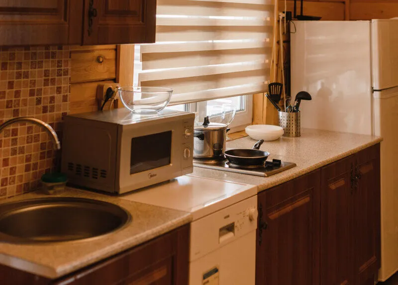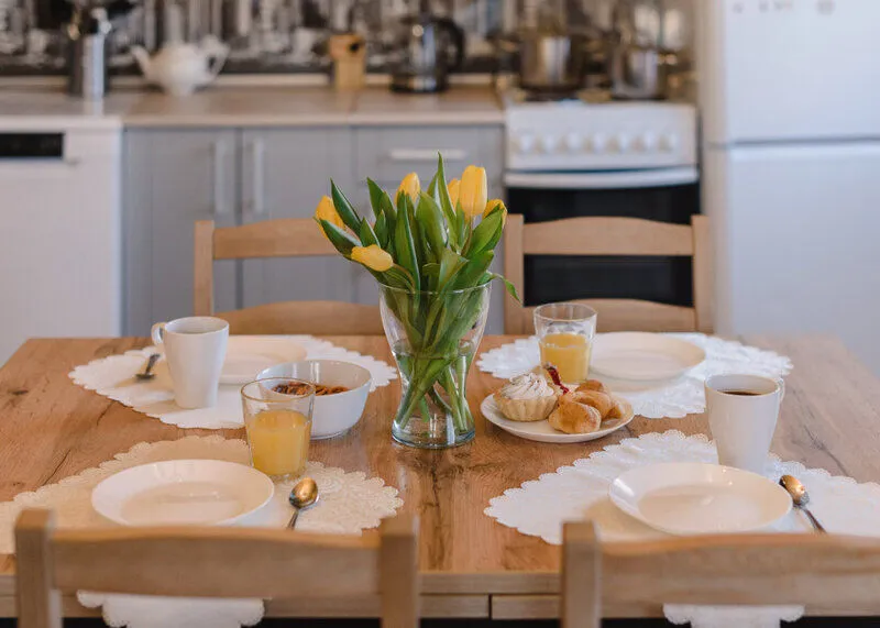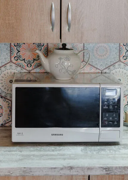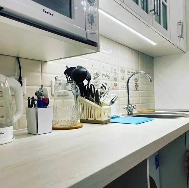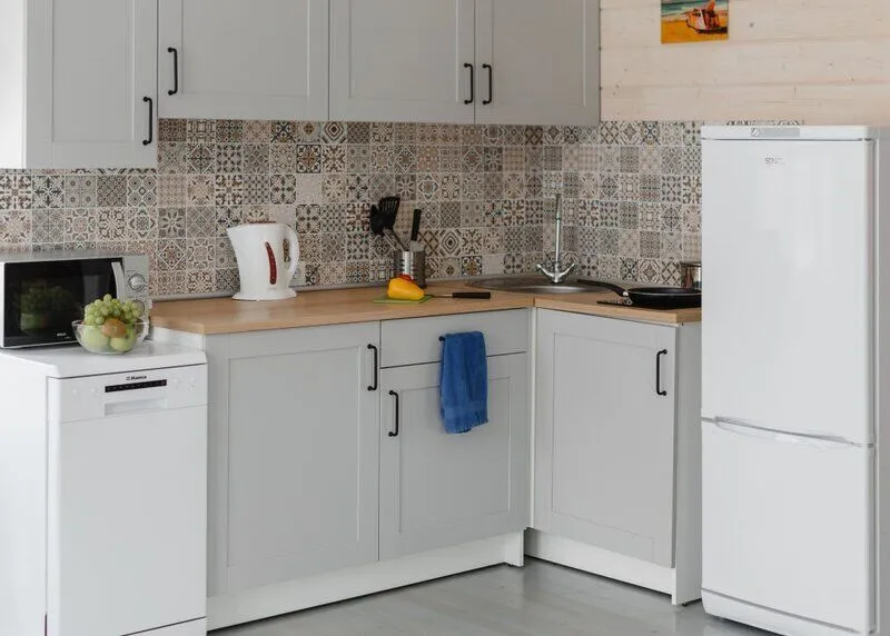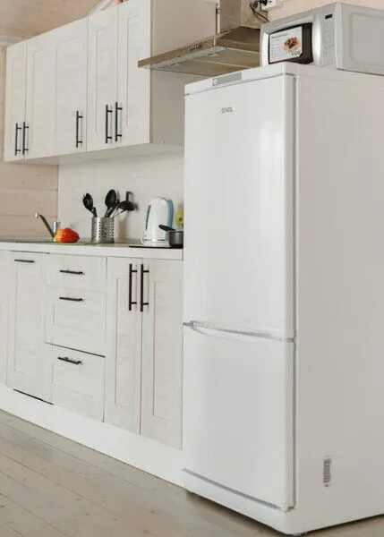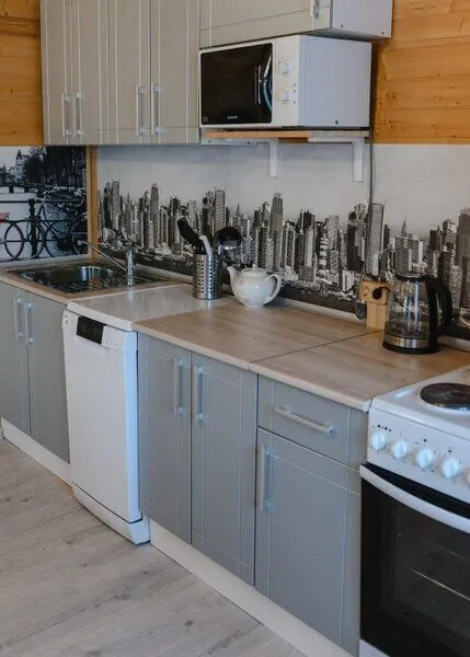 Оборудованная кухня со всей необходимой техникой (холодильник, плита, микроволновая печь, чайник) и полным набором посуды.