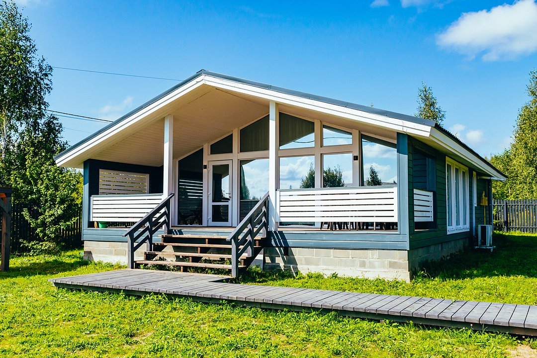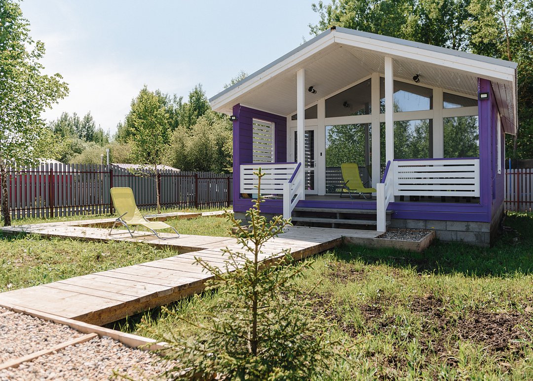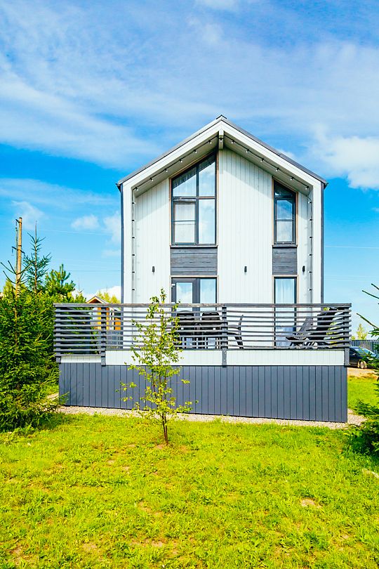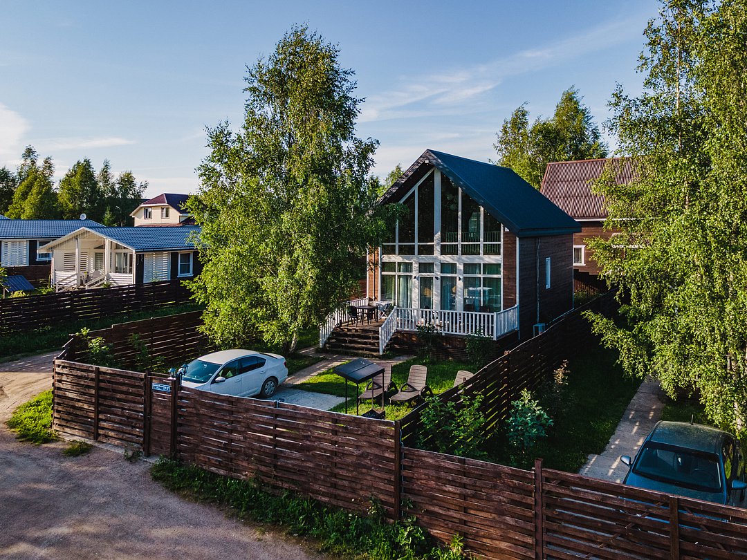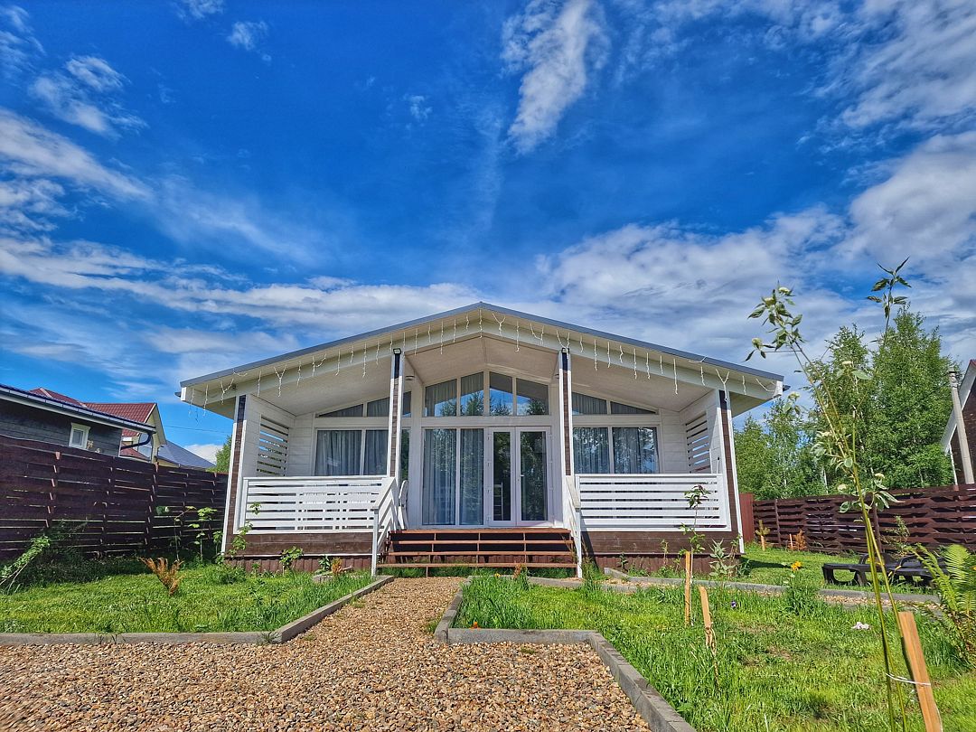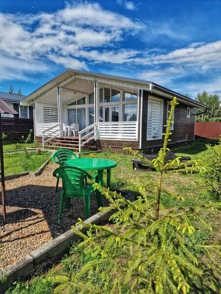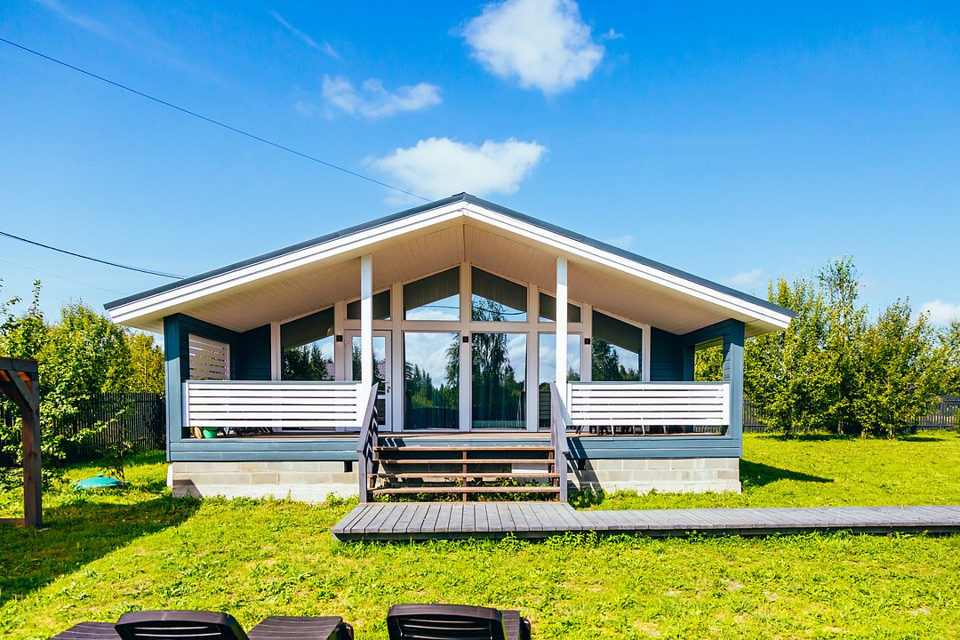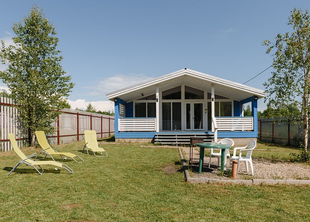Одноэтажный дом с двумя спальнями и гостиной. В доме есть собственная сауна и панорамные окна.