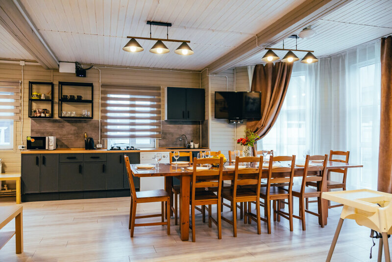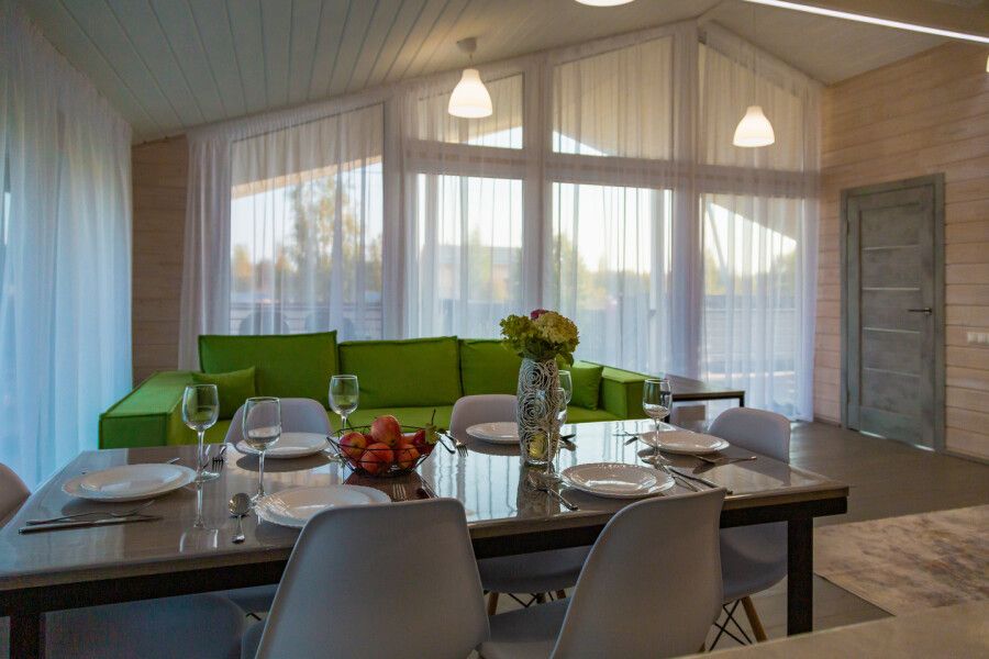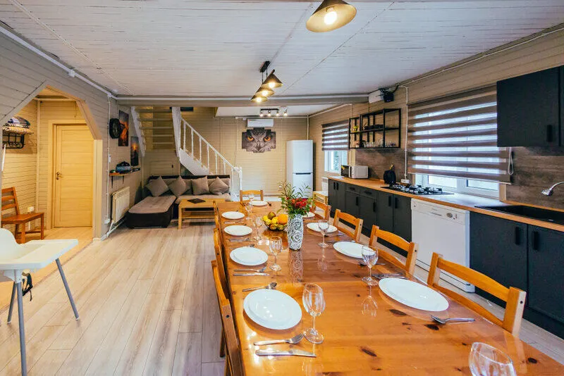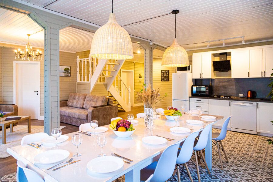 Стильный Барнхаус с огромной террасой. Общая площадь дома - 100 м2. В доме - 3 спальни с удобными двуспальными кроватями и гостиная с диваном, где смогут разместиться в общей сложности до 6 человек. Оборудованная кухня со всей необходимой техникой (холодильник, плита, посудомоечная машина, микроволновая печь, чайник) и полным набором посуды. В гостиной- СМАРТ ТВ. Бесплатный интернет через Wi-Fi. В доме есть два санузла. Дополнительно можно воспользоваться мангалом и террасой с уличной мебелью в саду. Также к услугам гостей зона отдыха с качелями и костровая площадка. Дом имеет свою огороженную территорию площадью 1400 м2. Также можно воспользоваться собственной парковкой для автомобилей.
