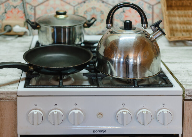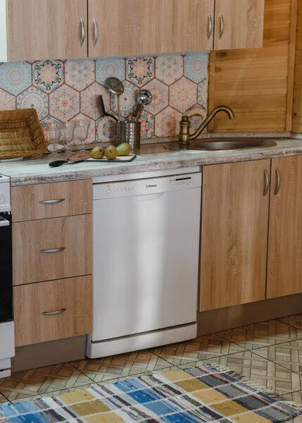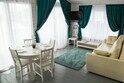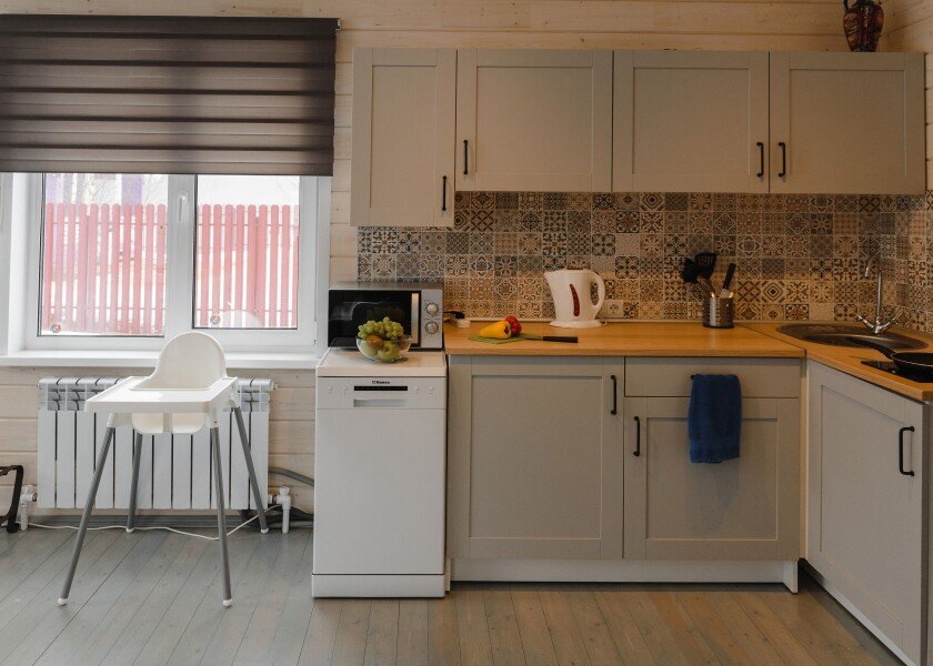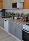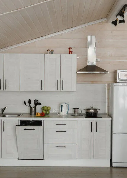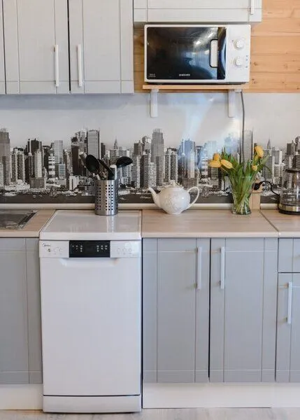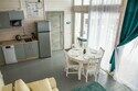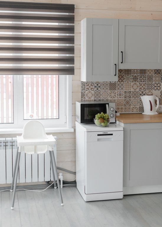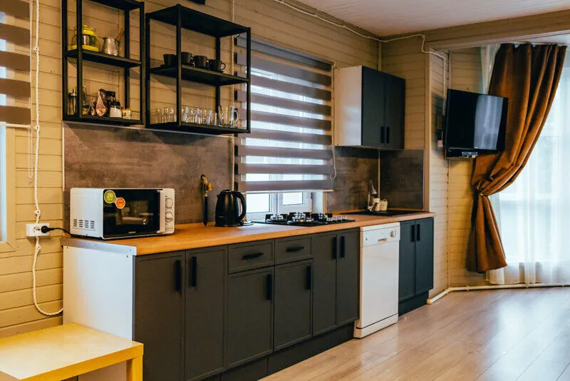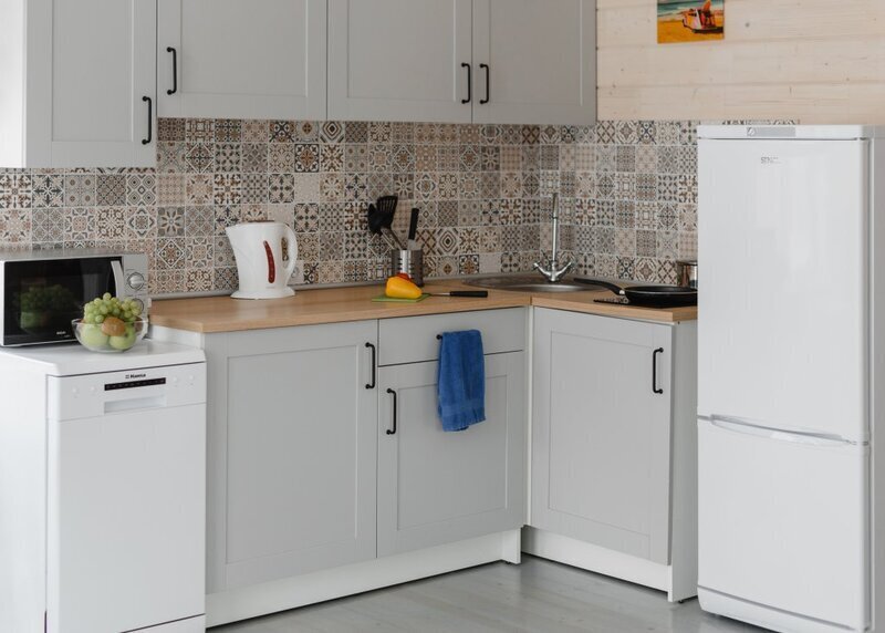 Оборудованная кухня со всей необходимой техникой (холодильник, плита, посудомоечная машина, микроволновая печь, чайник) и полным набором посуды.