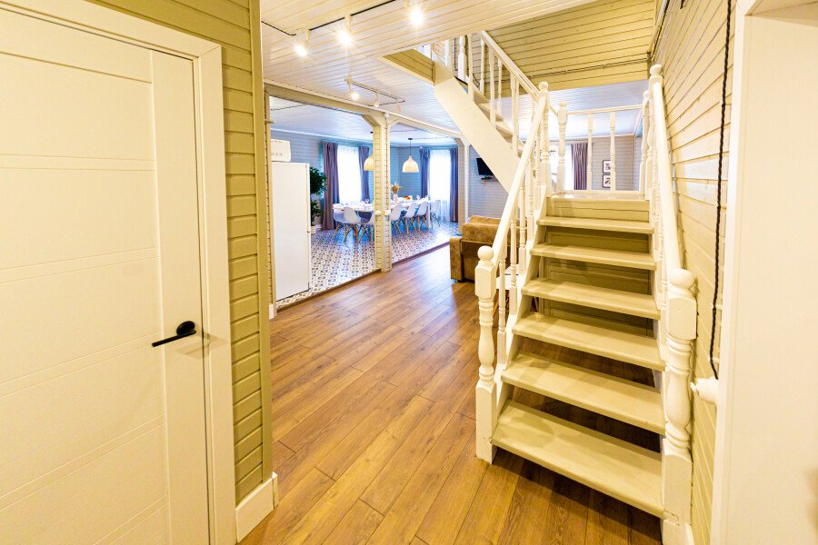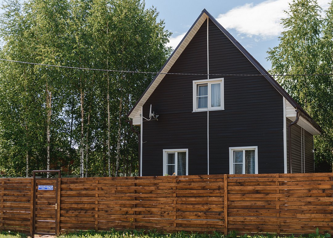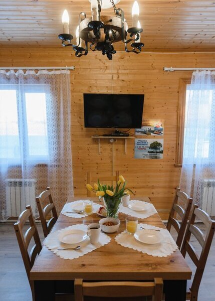 В доме — 3 спальни с удобными двуспальными и односпальными кроватями и гостиная с диваном, где смогут разместиться в общей сложности до 8 человек. Оборудованная кухня со всей необходимой техникой (холодильник, плита с духовым шкафом, посудомоечная машина, микроволновая печь, чайник) и полным набором посуды. В гостиной — СМАРТ ТВ. Бесплатный интернет через Wi-Fi. В доме есть санузел и финская сауна!