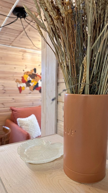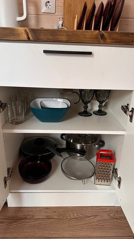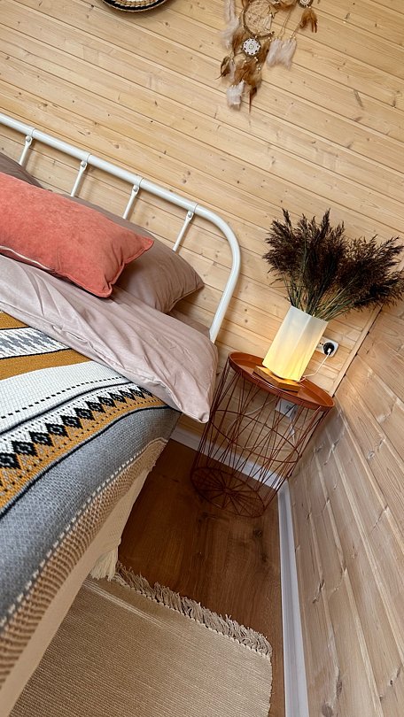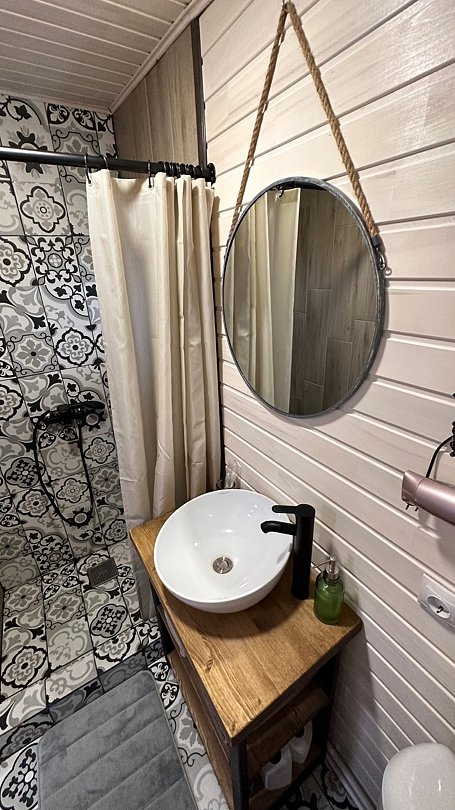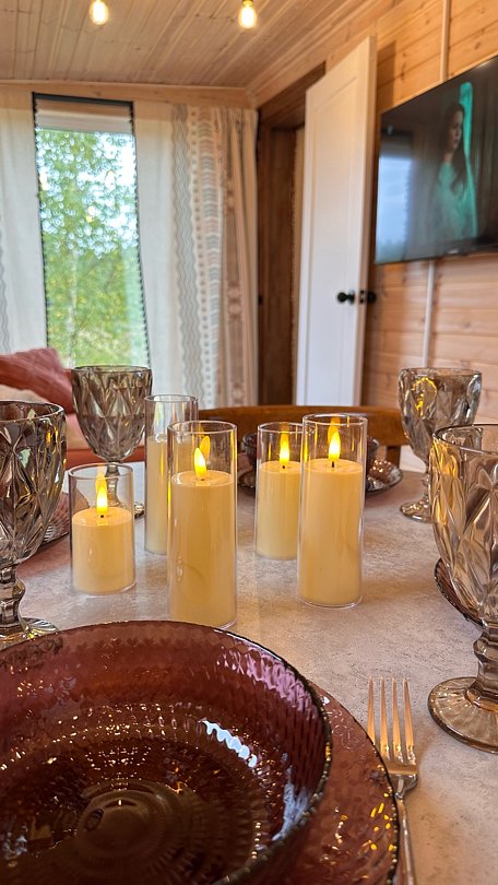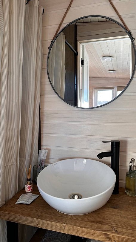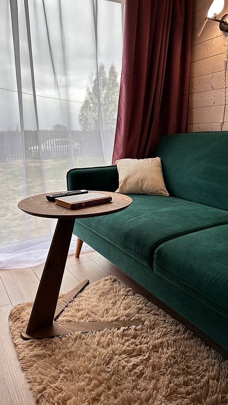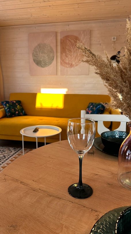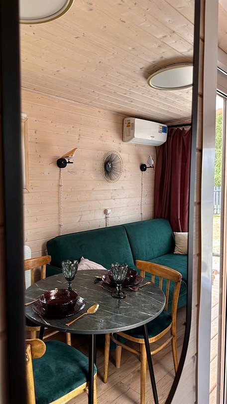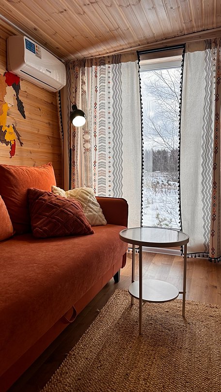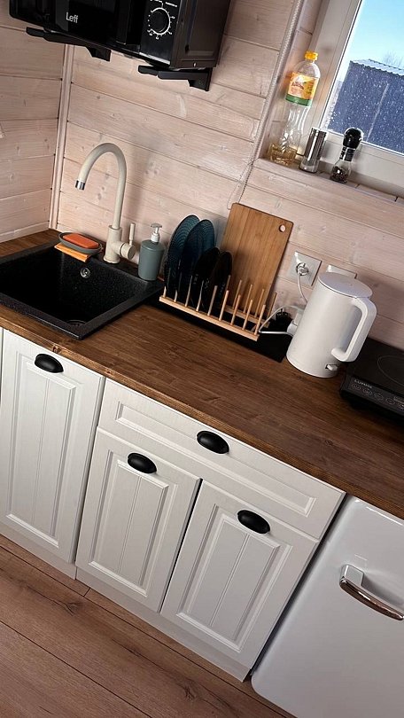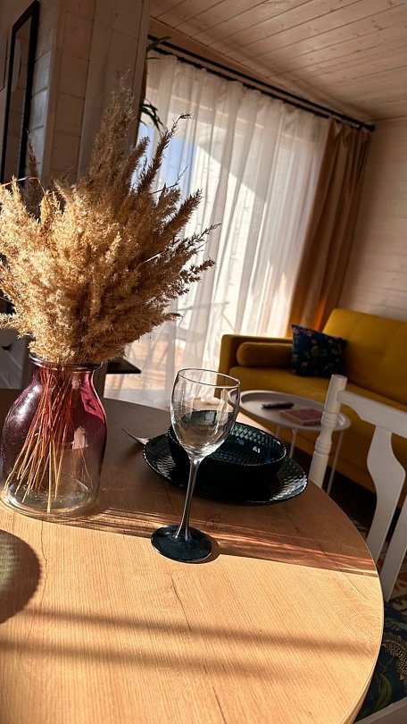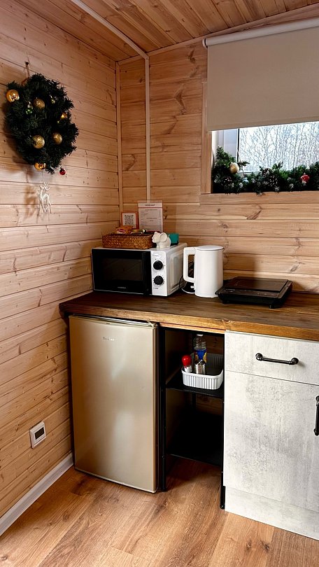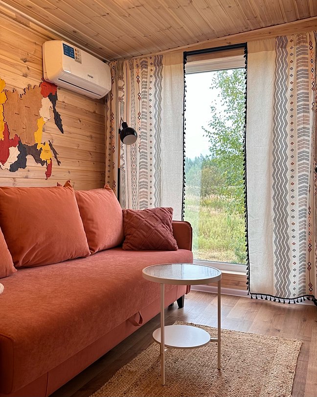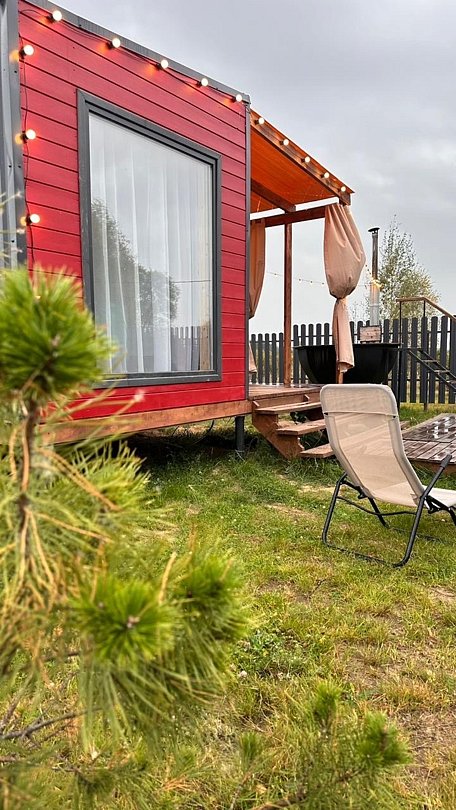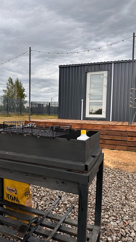 Каждый домик оборудован собственной зоной барбекю с мангалом, решеткой, розжигом и углём. Внутри вас ждёт уютная спальная зона с двуспальной кроватью и раскладным диваном. Для вашего удобства предусмотрена полностью укомплектованная кухня с красивой посудой, индукционной плитой, микроволновкой, холодильником и электрическим чайником. К вашим услугам базовые продукты: чай, кофе, сахар и специи.