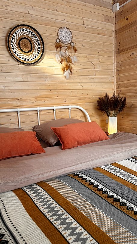 Интерьер в теплой гамме, с элементами бохо и эко-стиля. Особенности: проектор, баня на территории дома. Проектор — бесплатно. Баня оплачивается отдельно.
