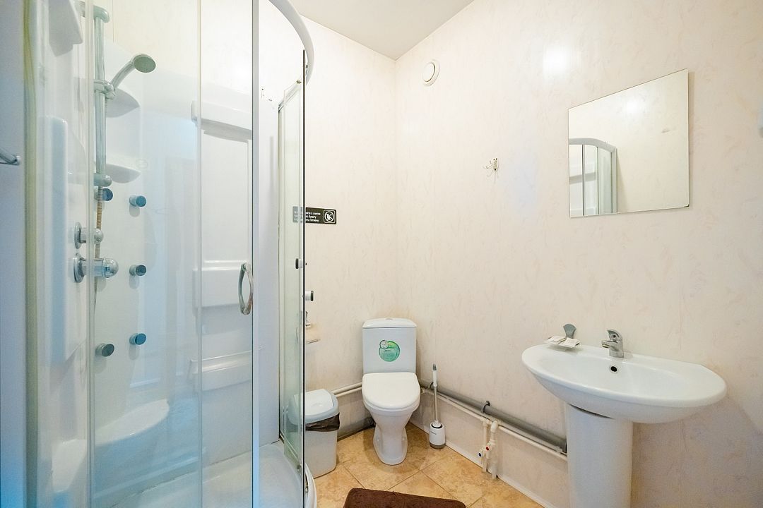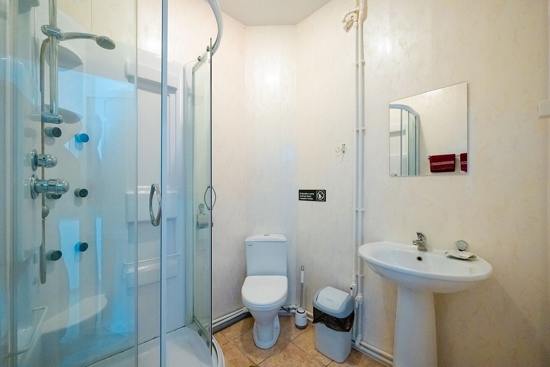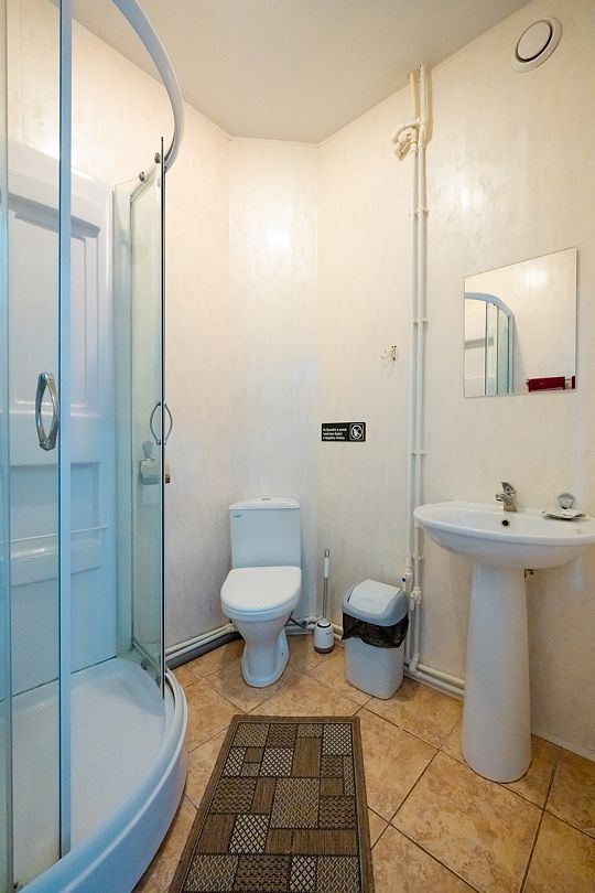 В номере есть телевизор со спутниковыми каналами, кондиционер, мини-холодильник, комод, кресло, стулья, тумбочки, вешалка для одежды. Сан. узел общий в холле, включает умывальник, душевую кабину, унитаз. На каждого гостя предоставляется по 2 полотенца (банное и для рук), одноразовые тапочки, гель для душа, шампунь для волос. Тапочки для сауны, зубные щетки и паста можно приобрести за дополнительную плату.