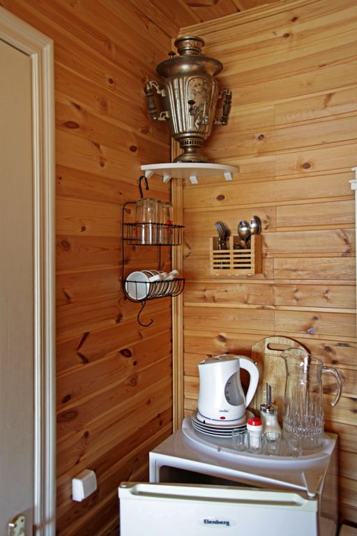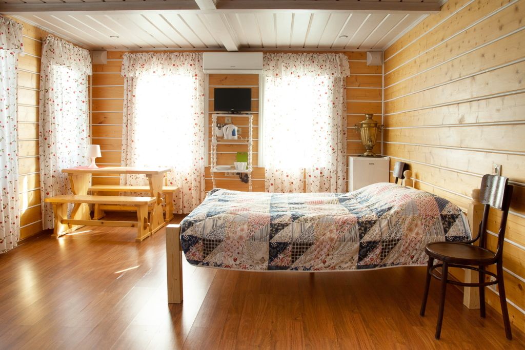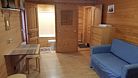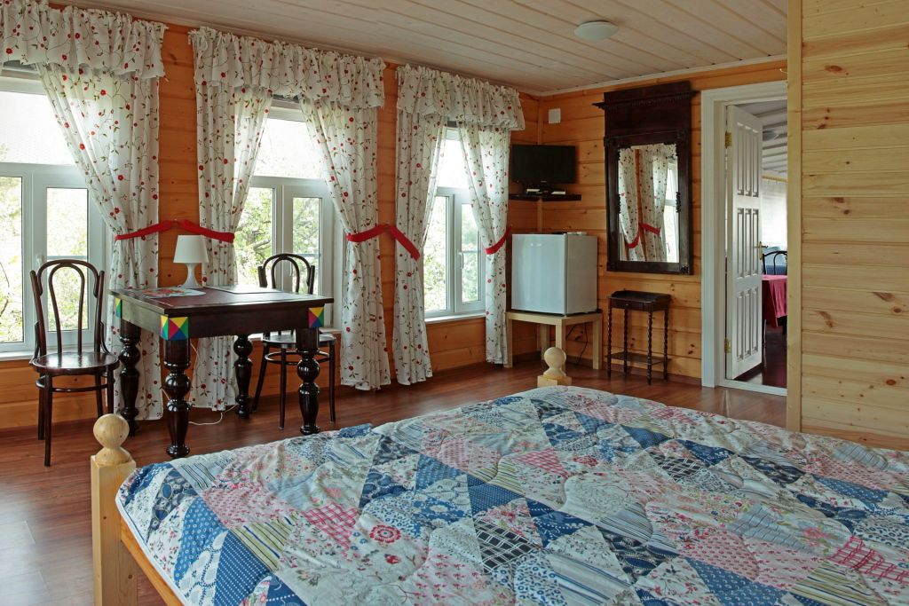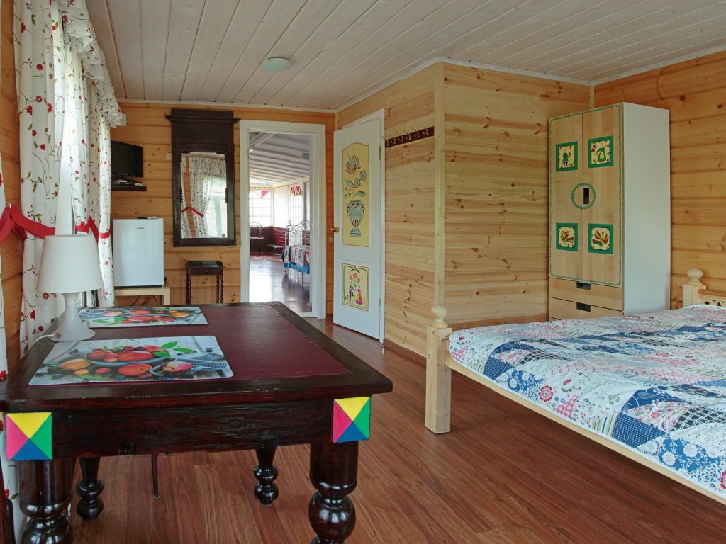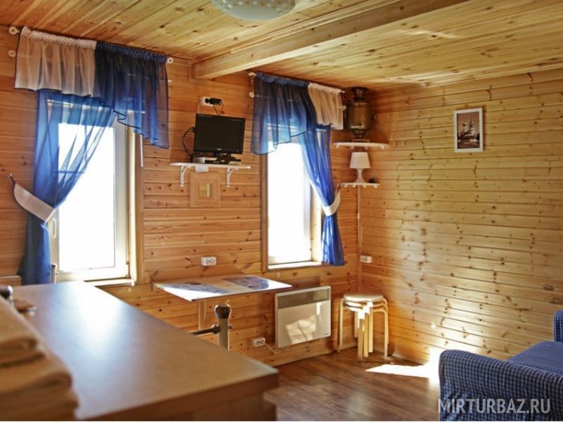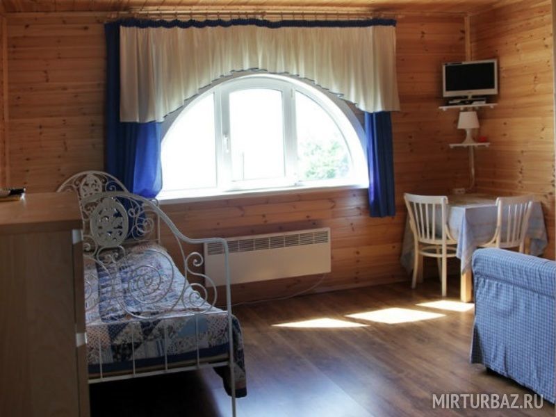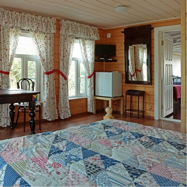 В номере: спальные места, санузел с ванной, кондиционер, платяной шкаф, зеркало, жалюзи, старинная горка под посуду, 2 стола, стулья, лавки, TV, чайник с чайными принадлежностями, холодильник, посуда, столовые приборы. Покрытие в гостиной - ковролин.